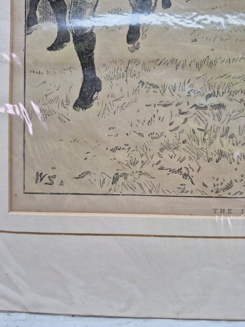 Signed "W.S." In Lower Left Corner. Mounted On Aged Paper Board With Decorative Inner Frame Border.