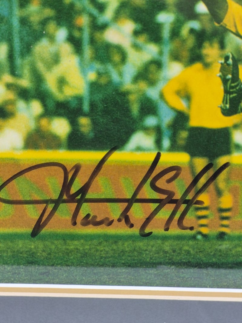 Professionally Framed Signed Photograph Of Mark Ella In Wallabies Gold And Black Striped Jersey.