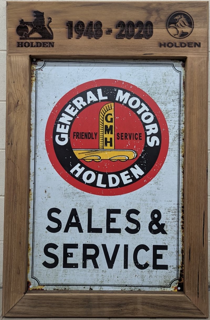Item Features Holden Logos With '1948-2020' On Upper Board, General Motors Holden Sales And Services Sign In Centre Board