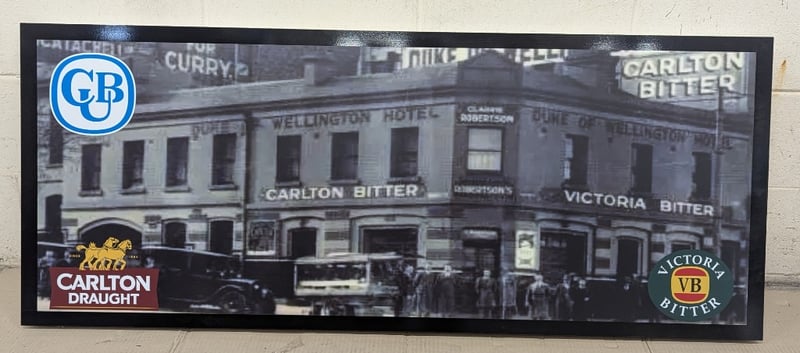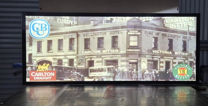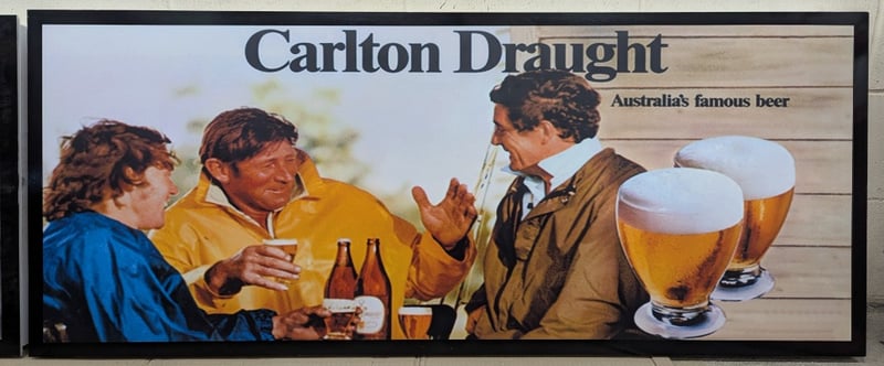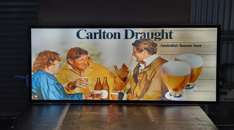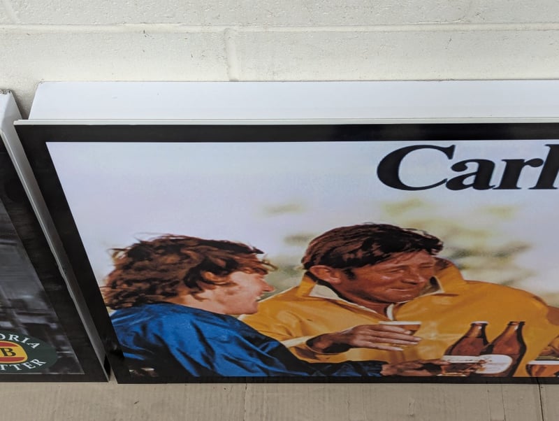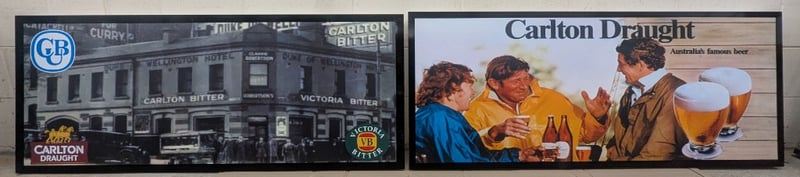 TWO CARLTON DRAUGHT AND BREWER LIGHT UP SIGNS Item Size: Height: 56cm, Width: 135cm, Depth: 7cm One Sign Features Carlton Draught Poster, Second Sign Features Drinks: Carlton Draught, Victoria Bitter And Cub, Inner Sign Features Lining Of Lights 586274+9