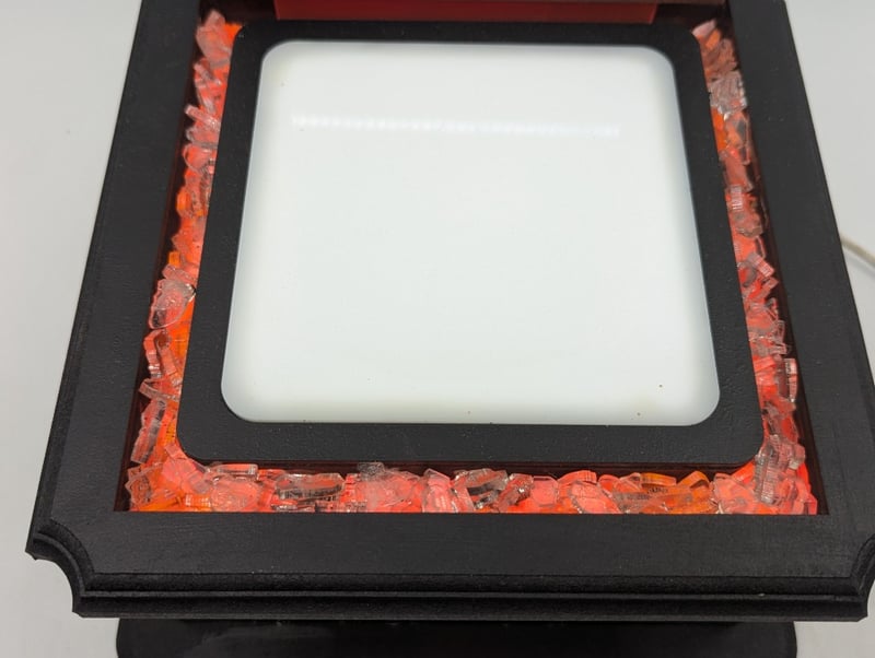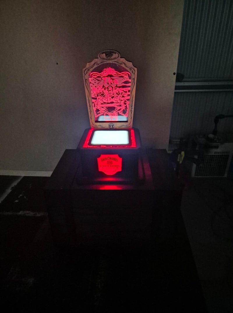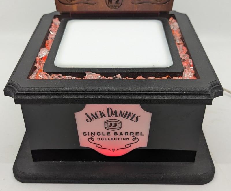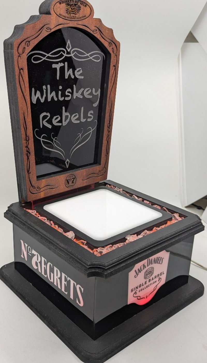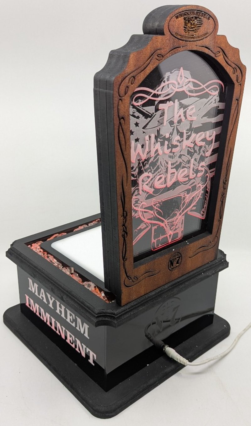 Black Base Pedestal, Plastic Case Cover, Orange Light Up Coal Style Design, Timber Top With Whiskey Rebels Logo Engraved, Timber Case
