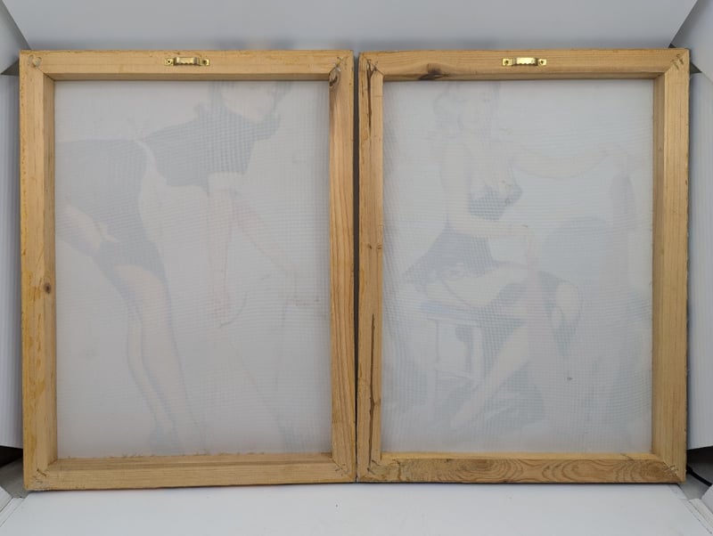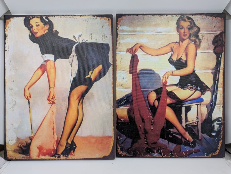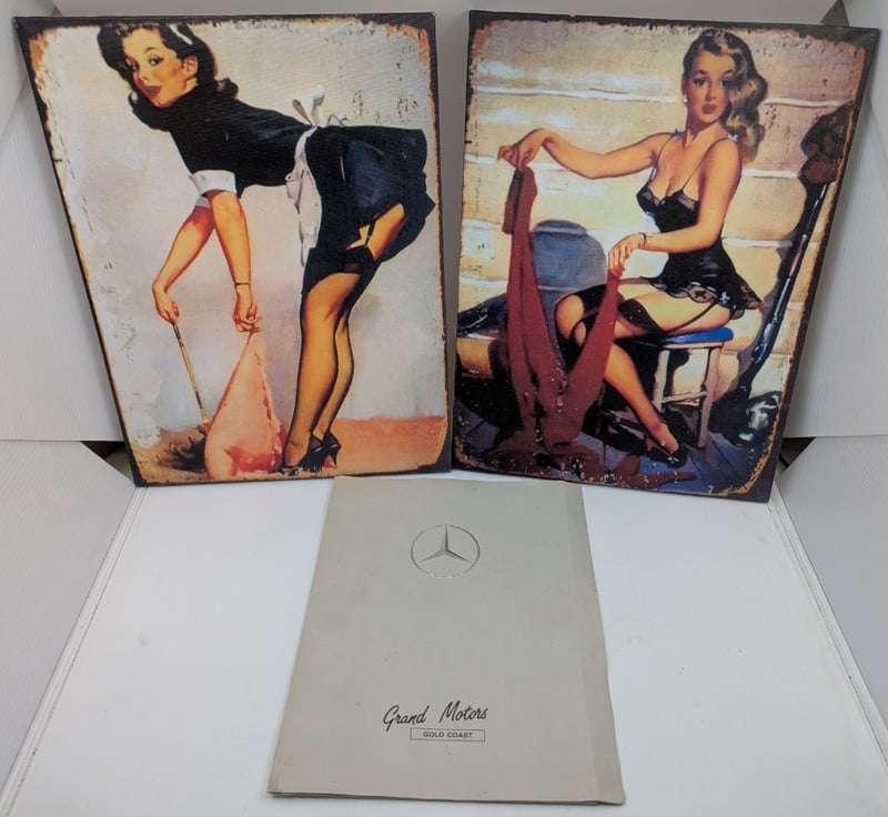 TWO PIN UP GIRL STYLE PRINTS ON CANVAS AND GRAND MOTORS PHOTO ALBUM