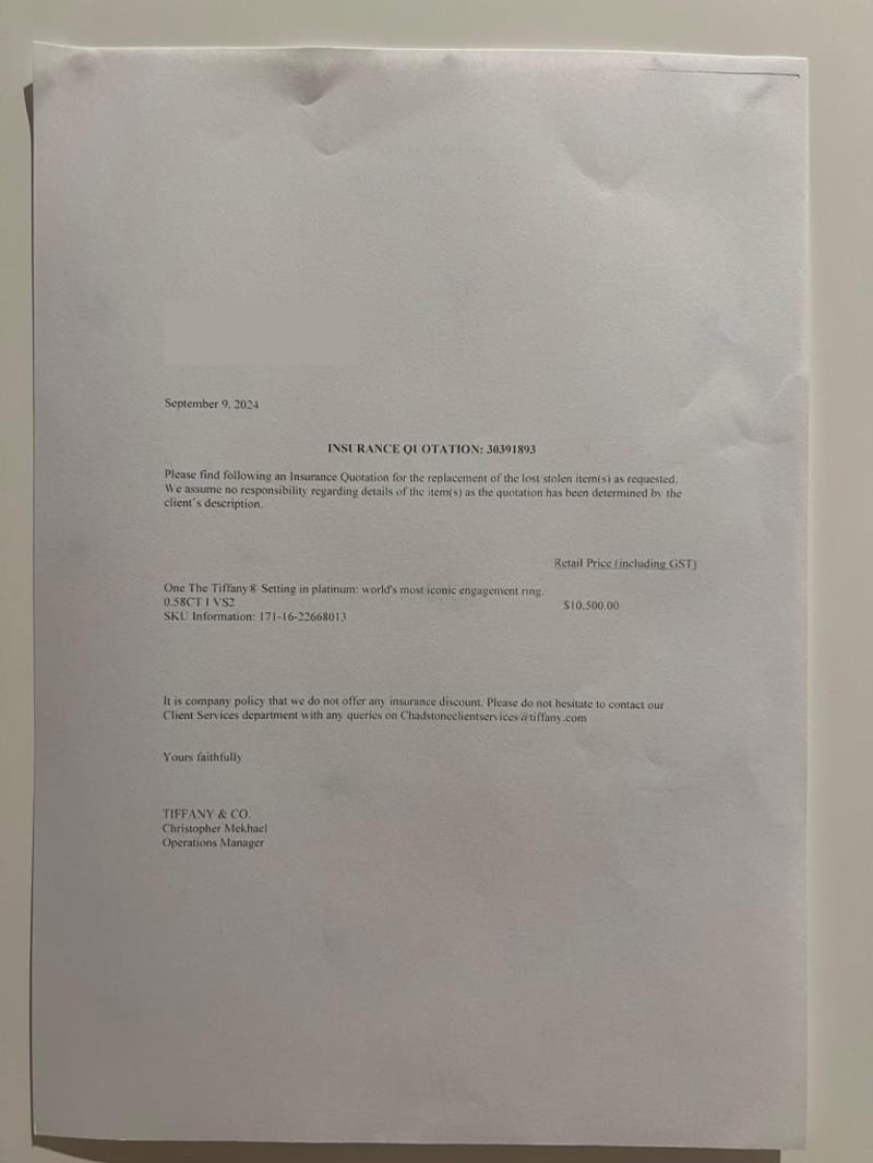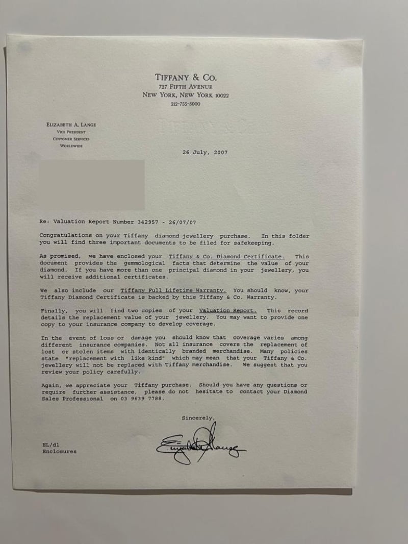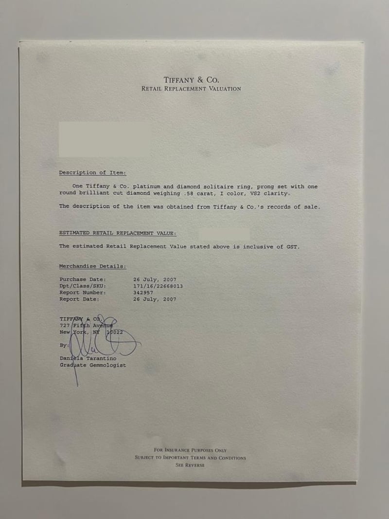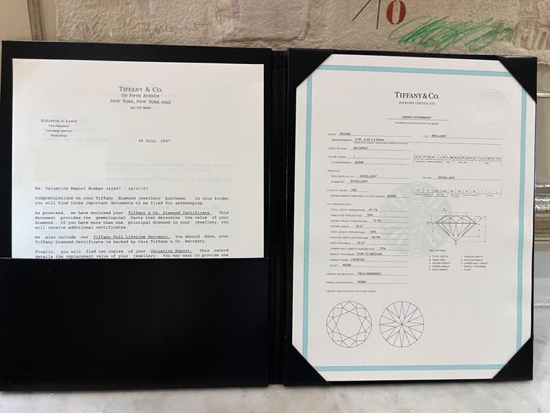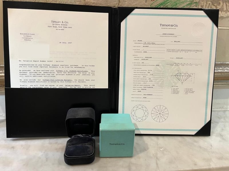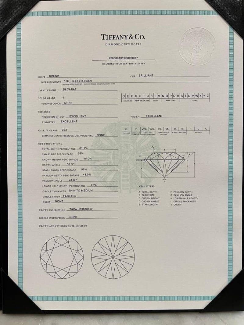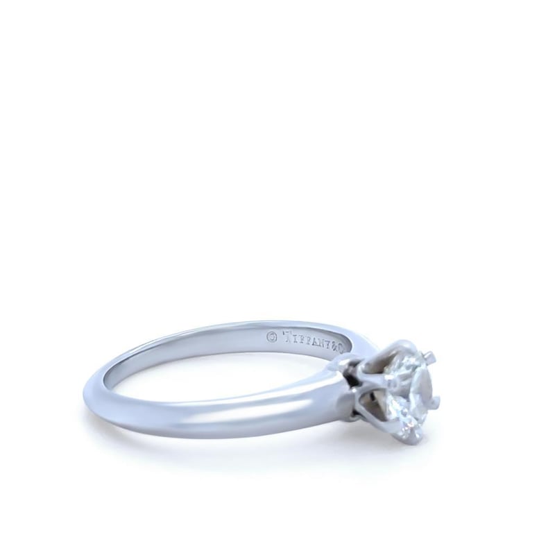 Signed Tiffany & Co Pt950 .58Ct 22668013. Accompanied With The Tiffany Green Outer Box And Black Ring Box, As Well As A Tiffany Black Folder Containing The Original Valuation From 2007 And Diamond Certificate. Included With The Purchase Are A Retail Replacement Valuation, The Original Purchase Date Of 26/07/2007, Report Number 342957 Dated 26/07/2007, And The Diamond Certificate (22668013/H09080057). Additionally, It Includes The Tiffany & Co. Insurance Quotation Number 30391893, Dated 9/10/2024.