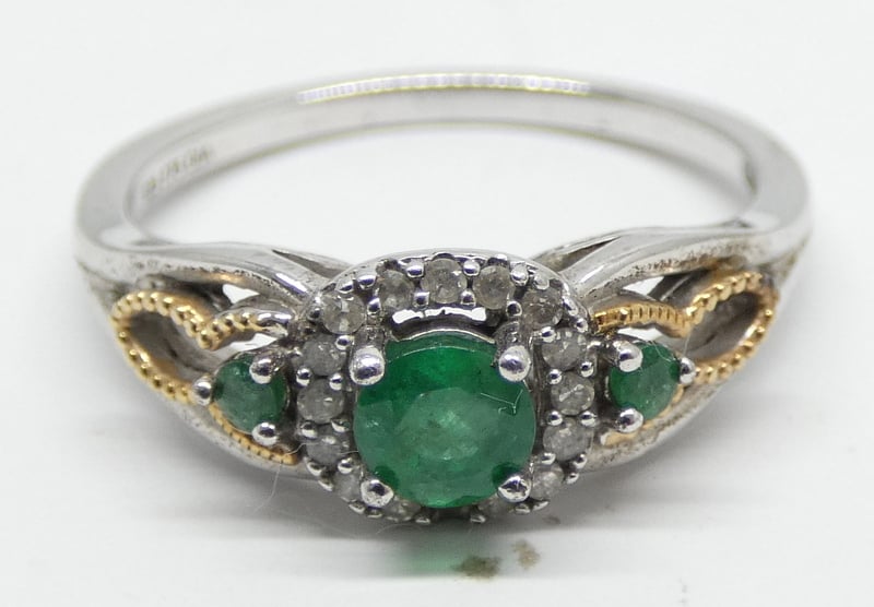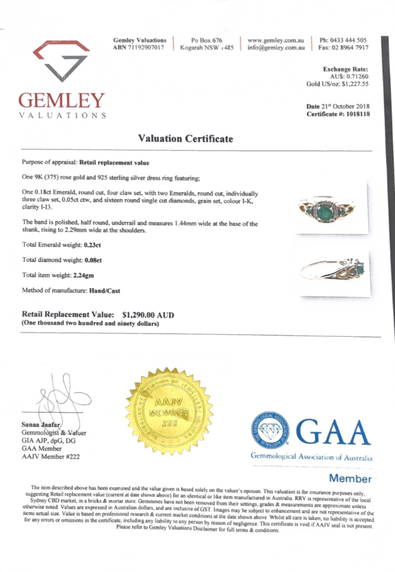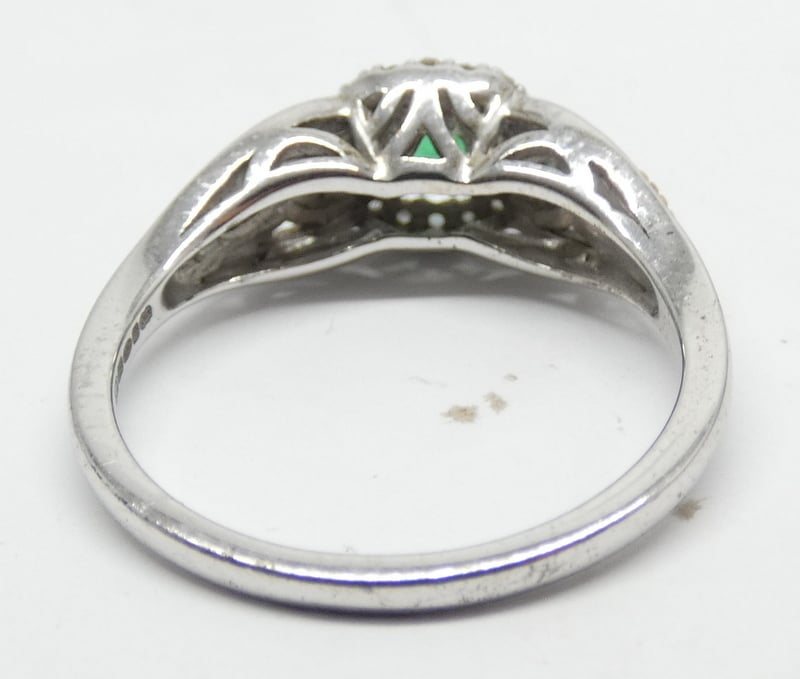 Featuring Centre, Round Cut Emerald (0.18Ct), Four Claw Set, With 2 Round Cut Emeralds (0.05Ctw), Three Claw Set And 16 Round Single Cut Diamonds, (0.08Ctw), I-I3 In Clarity, I-K In Colour, Grain Set.