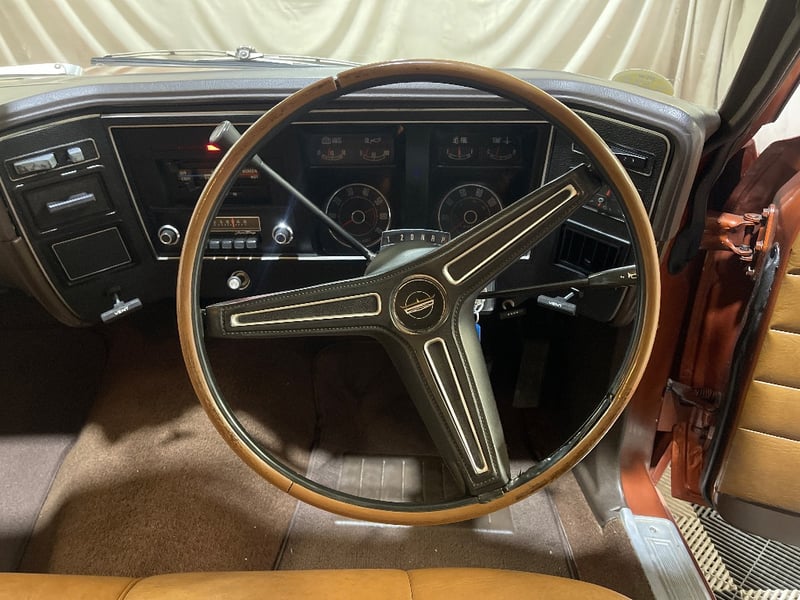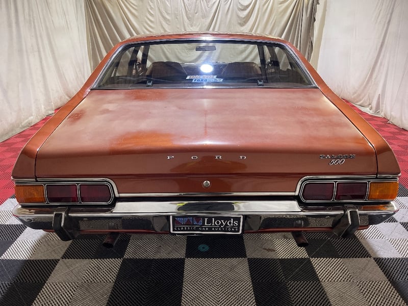 1974 Ford XB Falcon 500 four‑door sedan finished in Copper Bronze. Rear‑wheel drive, powered by a 302ci (4.9‑litre) V8 petrol engine paired with an automatic transmission. Odometer indicating just 16,069 miles.