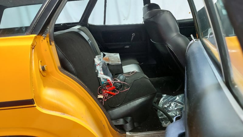 1977 Ford XC Falcon four‑door station wagon finished in orange. Rear‑wheel drive configuration powered by a 4.9‑litre V8 petrol engine paired with an automatic transmission. Odometer indicating 175,591 kilometres.