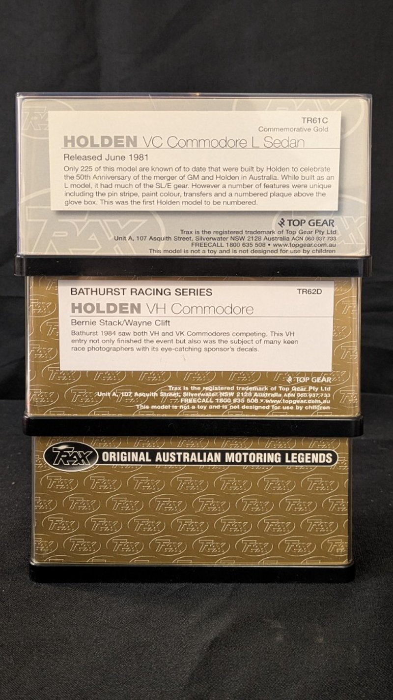 Trax Die Cast Model Cars including Holden VB Commodore SL/E sedan TR60C and Holden VH Commodore Bathurst Racing Series TR62D and Holden VC Commodore L Sedan TR61C in Commemorative Gold.