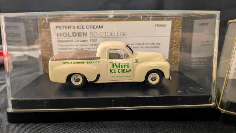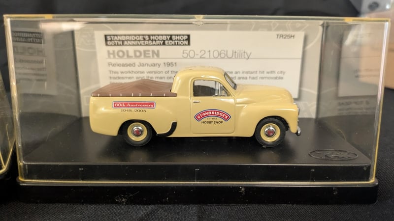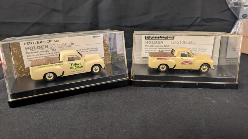 Trax Die Cast Model Cars including Holden 50-2106 Ute TR25G Peters Ice Cream and Holden 50-2106 Utility Stanbridges Hobby Shop 60th Anniversary Edition TR25H