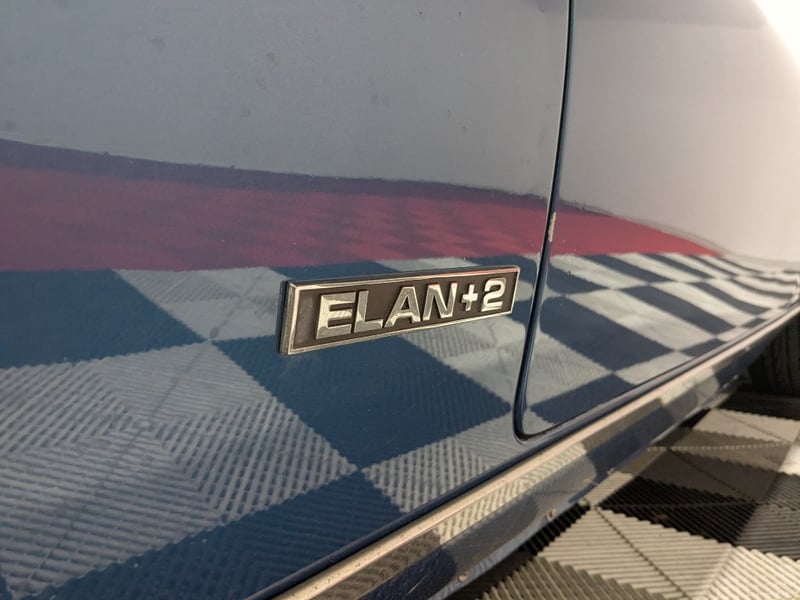 1973 Lotus Elan +2 finished in blue, featuring a rear‑wheel drive layout and powered by a 1.6‑litre inline four‑cylinder petrol engine paired with a manual transmission. Odometer indicating 7,468 miles.