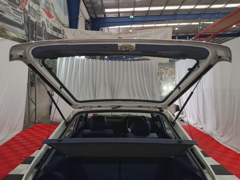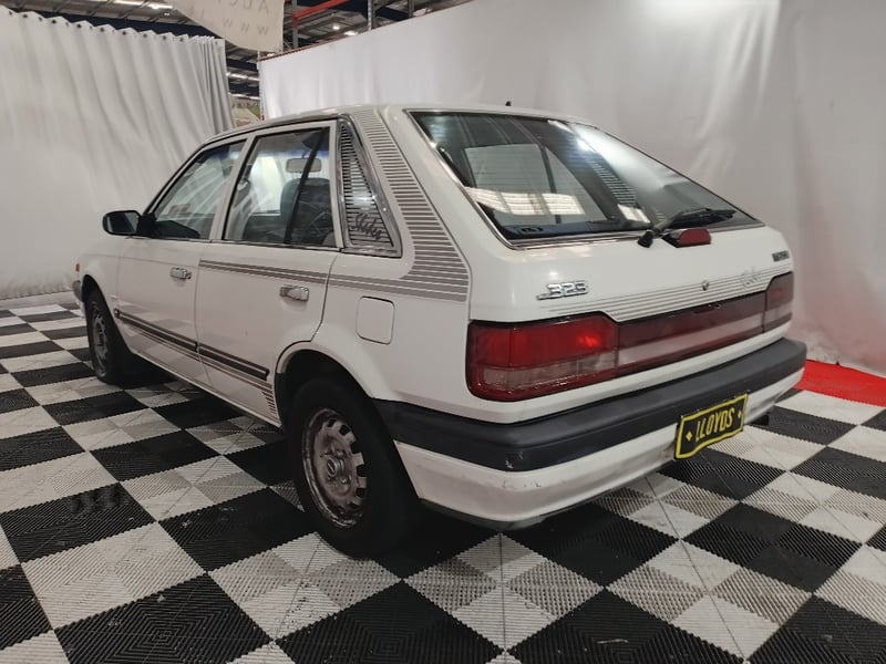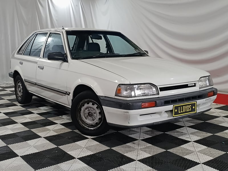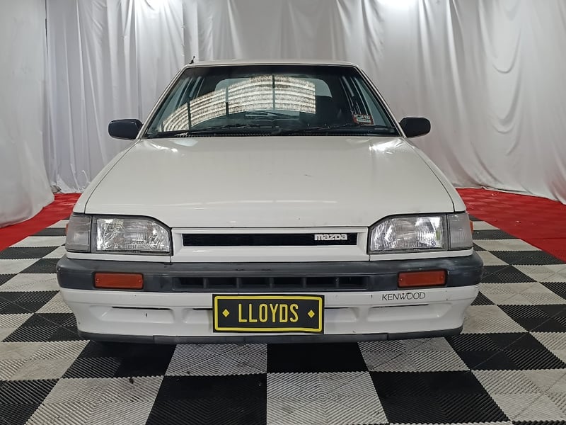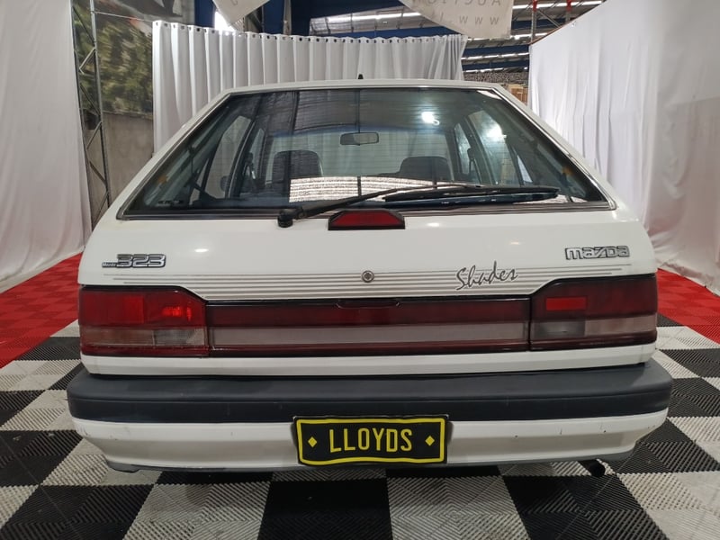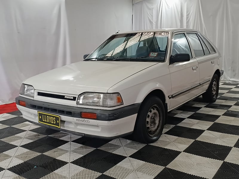 1989 Mazda 323 BF DX Shades five‑door hatchback finished in white. Front‑wheel drive layout powered by a 1.6‑litre inline four‑cylinder petrol engine paired with a manual transmission. Odometer indicating 105,087 kilometres.