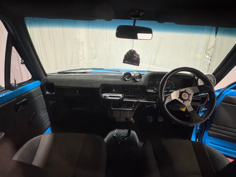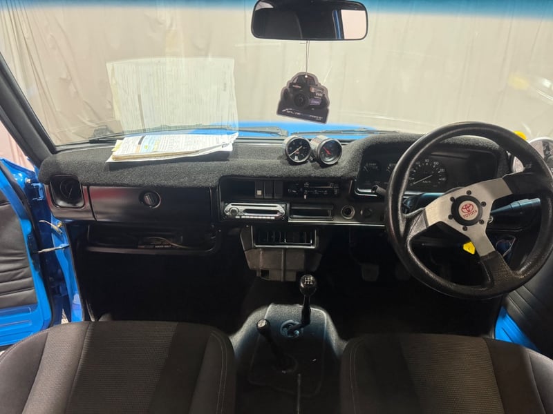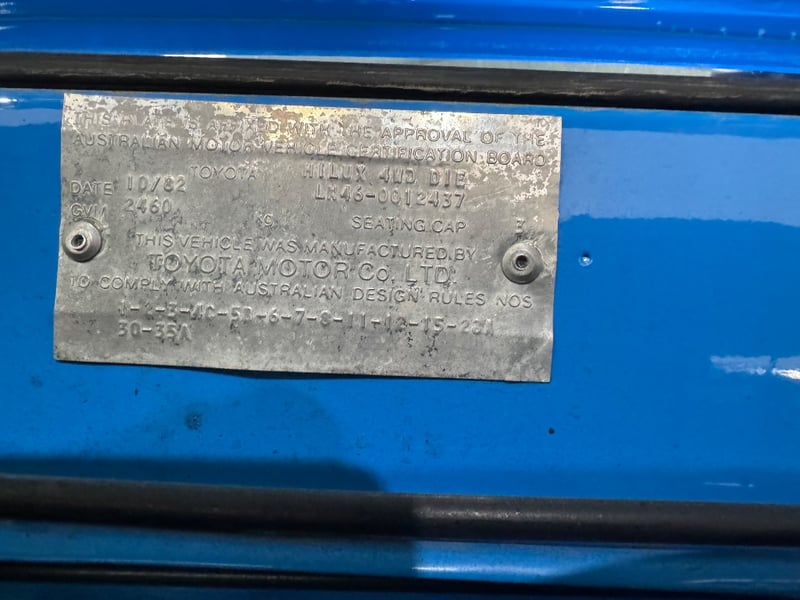1982 Toyota Hilux single cab utility finished in Blue. Four‑wheel drive configuration powered by a 6‑cylinder petrol engine paired with a manual transmission. Odometer indicating 318,419 kilometres.