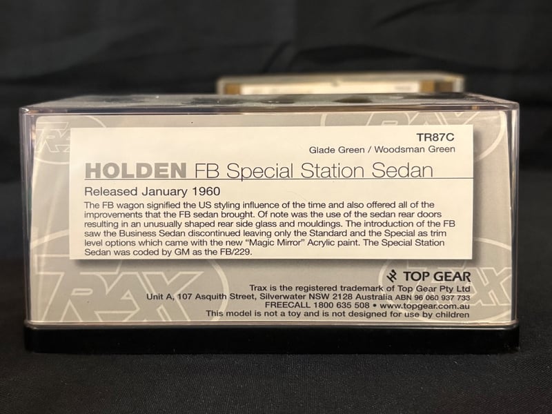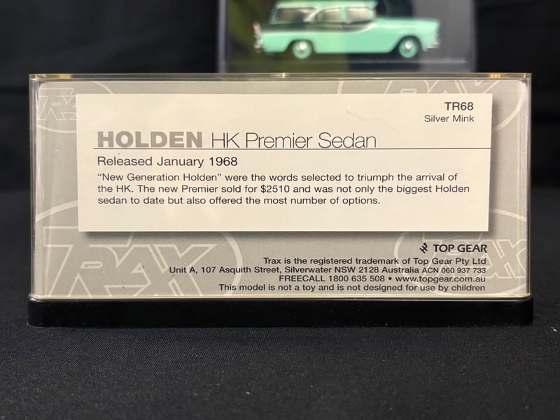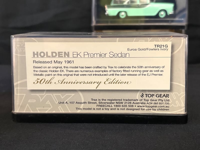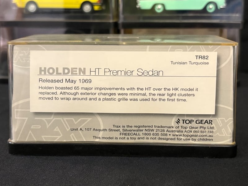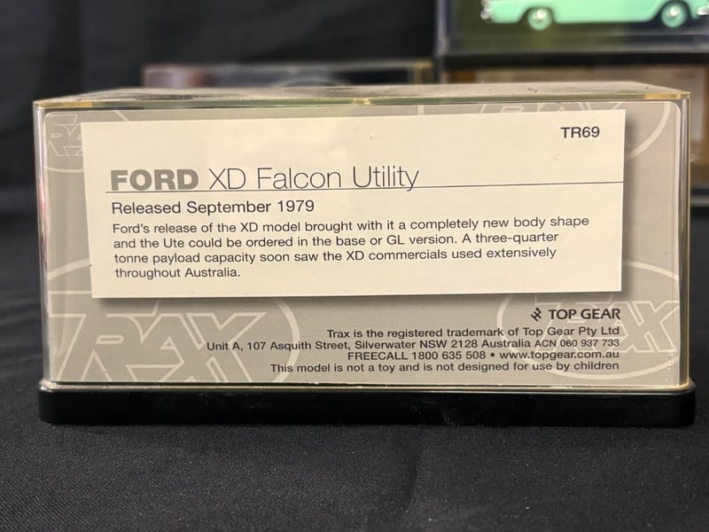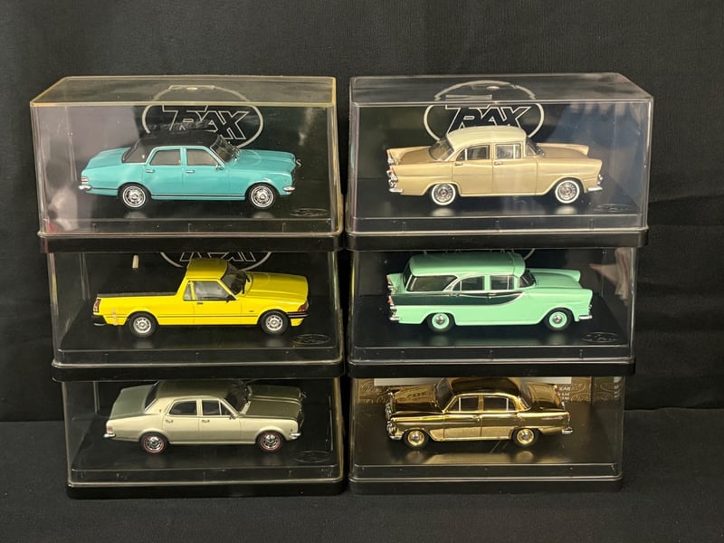 Trax “The Originals” 1:43 Scale Diecast Model Car Collection.Includes:Holden HT Premier Sedan – Tunisian Turquoise (TR82)Ford XD Falcon Utility (TR69)Holden HK Premier Sedan – Silver Mink (TR68)Holden EK Premier Sedan 50th Anniversary Edition – Euroa Gold/Fowlers Ivory (TR21G)Holden FB Special Station Sedan – Glade Green/Woodsman Green (TR87C)Chrysler AP6 Valiant V8 Sedan – Alpine White/Black Vinyl Roof (TR81C)