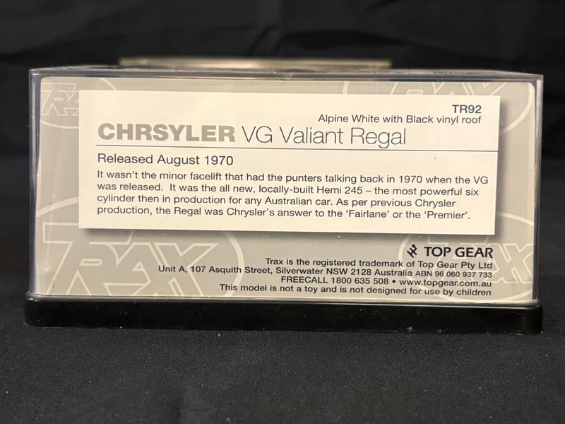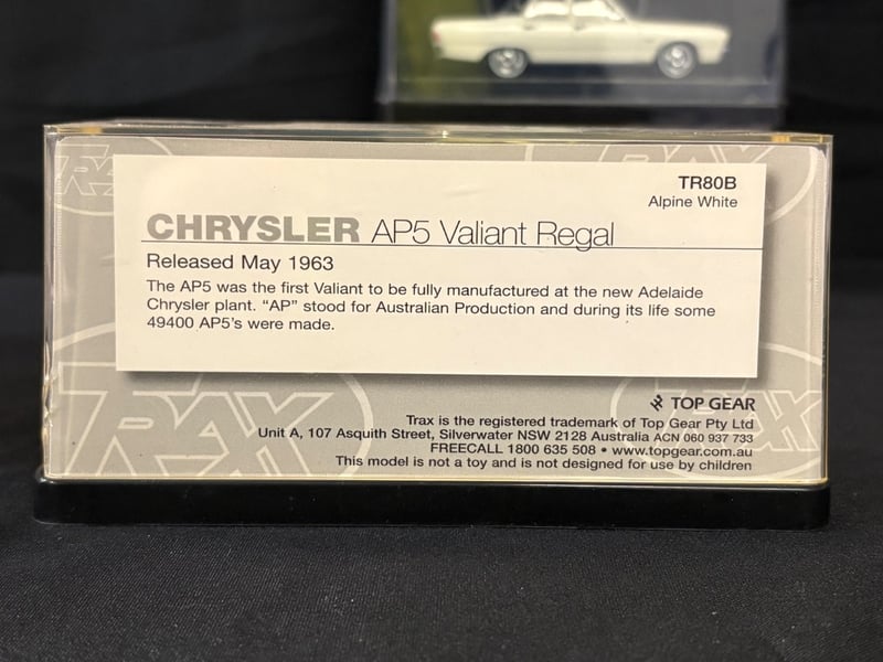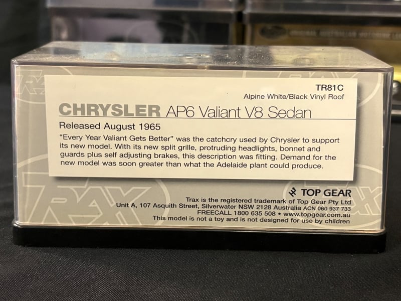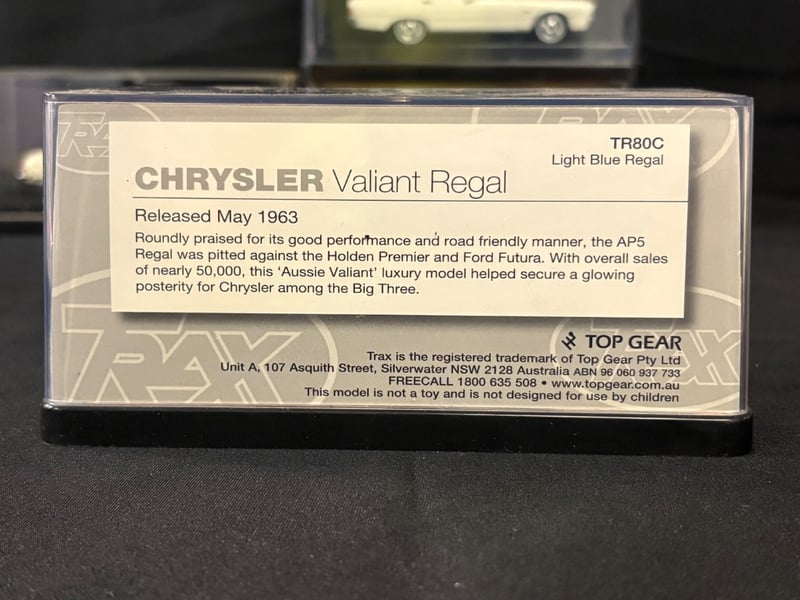 Trax “The Originals” 1:43 Scale Diecast Model Car Collection.Includes:Holden HT Premier Sedan – Tunisian Turquoise (TR82)Ford XD Falcon Utility (TR69)Holden HK Premier Sedan – Silver Mink (TR68)Holden EK Premier Sedan 50th Anniversary Edition – Euroa Gold/Fowlers Ivory (TR21G)Holden FB Special Station Sedan – Glade Green/Woodsman Green (TR87C)Chrysler AP6 Valiant V8 Sedan – Alpine White/Black Vinyl Roof (TR81C)Chrysler Valiant Regal – Light Blue Regal (TR80C)