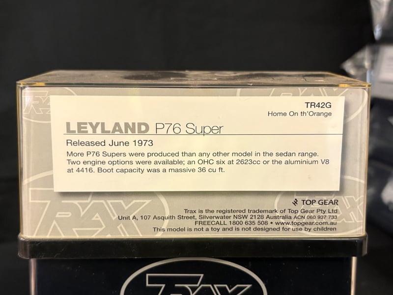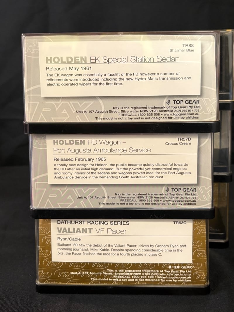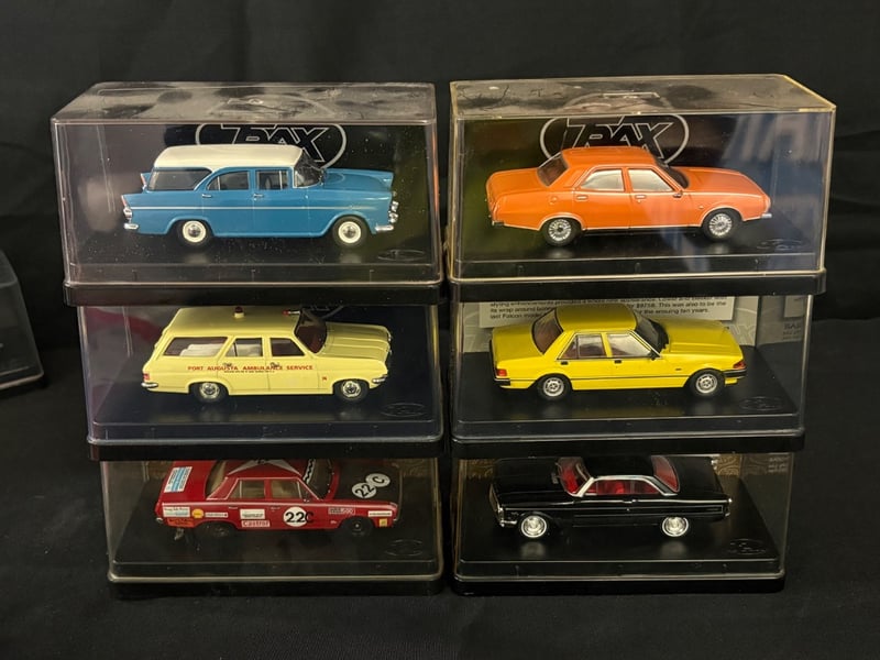 Trax “The Originals” 1:43 Diecast Model Car Collection Includes the following models:• Ford XE Falcon GL Sedan – Citrus Yellow (TR85B)• Ford XP Futura Hardtop (TR51C)• Leyland P76 Super – Home On th’ Orange (TR42G)• Holden EK Special Station Sedan – Shalimar Blue (TR88)• Holden HD Wagon – Port Augusta Ambulance Service (TR57D)• Valiant VF Pacer – Bathurst Racing Series (TR63C)