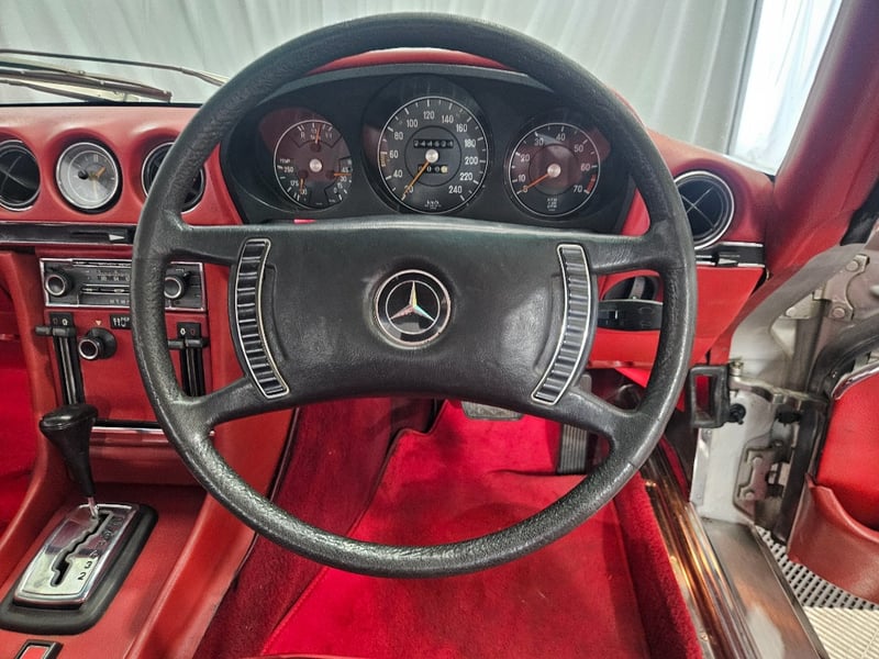 A classic early R107-series roadster, finished in Silver and showing an indicated 244,521 kilometres, representing the beginning of one of Mercedes-Benz’s longest-running and most celebrated model lines.