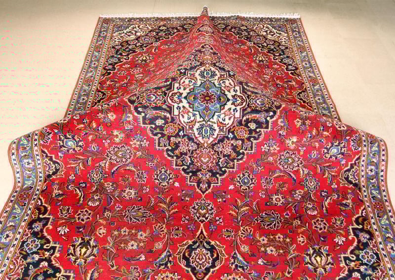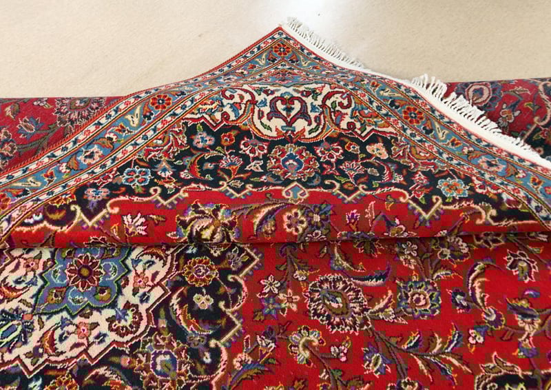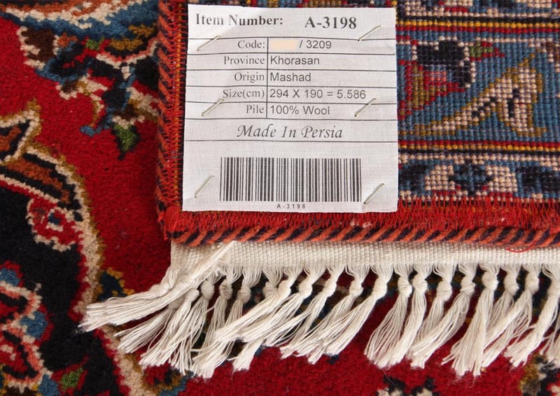 A PERSIAN MASHAD CARPET.100% Lambs Wool Polished Pile, Very Solid And Densely Hand Knotted. In A Traditional Design Of A Central Medallion Shah Abbasi Palmettes In Tones Of Red And French Blue. Origin: Persia. Rrp: $3200 Circa 1980S. Size(Cm): 294X190Condition: Good - Refer To Images488472+34(Shipping: 90cm L X 25 cm W X 30 cm HX 25 Kg - Folded)