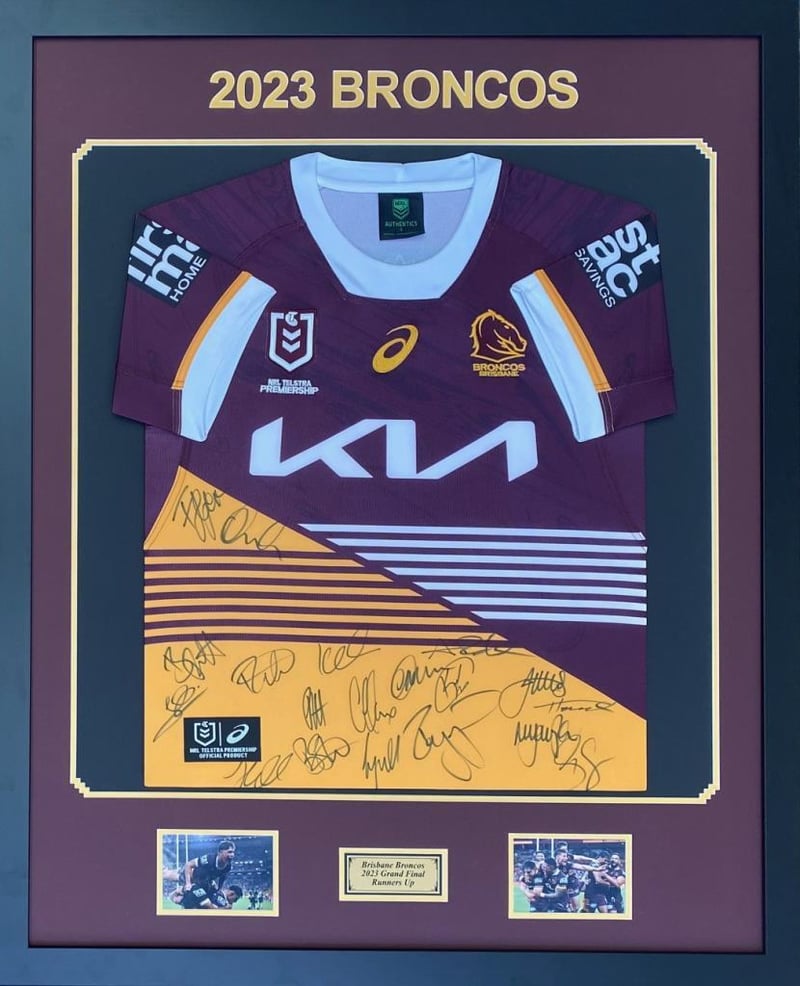 2023 BRISBANE BRONCOS PERSONALLY SIGNED JERSEY Framed Using Double Mats, 2 Unsigned Photographs And A Plaque. Hand Signed By 17 Members Of The 2023 Brisbane Broncos Squad Using A Black MarkerAccompanied By A Certificate Of AuthenticitySize: 109cm x 89cm x 2Condition: Good - Refer To Images488505+5