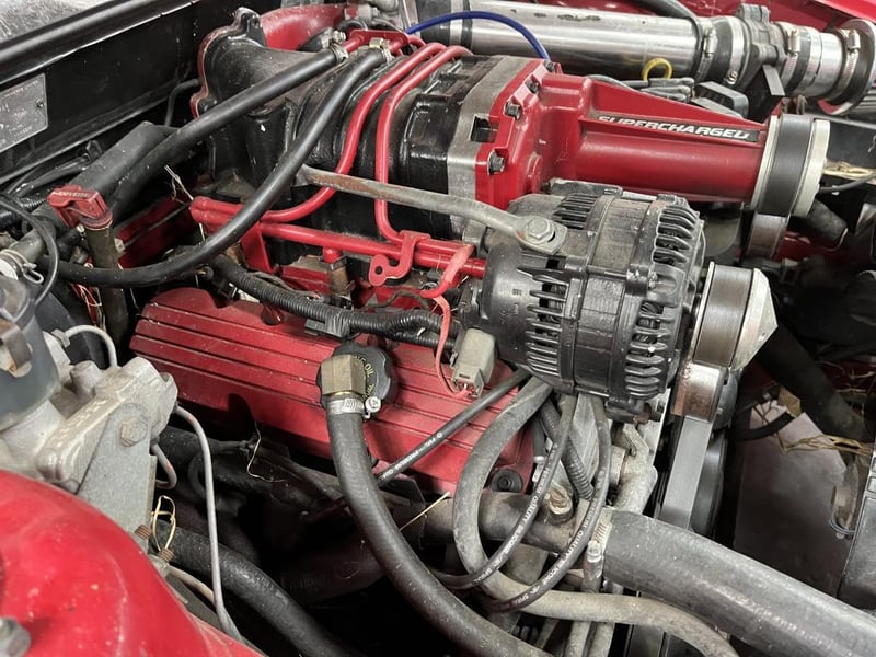 Presentation is honest and unrestored. The red paint has faded and lost clear coat across the bonnet and roof, while the sides and rear retain better gloss. Panels are straight with consistent gaps and no obvious collision damage. The car sits on aftermarket five-spoke alloy wheels (not the original HSV items) with lowered suspension. Inside, the grey velour cloth interior is complete and original with no tears, though the seats and carpet show soiling consistent with 30-plus years of use. The dashboard is intact with no visible cracking, which is notable for a VP. Manual windows are fitted on the rear doors. The engine bay houses the Supercharged 6 Cylinder with its factory red-painted intake plenum and an aftermarket pod filter, and it presents in honest, un-detailed condition. An original Holden VP owner's handbook and service logbook with dealer stamps up to at least the 110,000km interval are included.