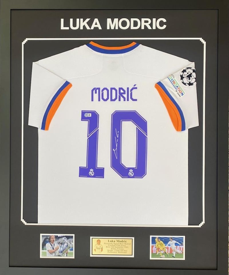 LUKA MODRIC PERSONALLY SIGNED REAL MADRID FOOTBALL JERSEY (BECKETT COA)Framed Using Double Mats, 2 Unsigned Photographs And A Plaque. Hand Signed By Luka Modric Using A Silver MarkerAccompanied By A Certificate Of Authenticity From BeckettSize: 109cm x 89cm x 2Condition: Good - Refer To Images488505+9