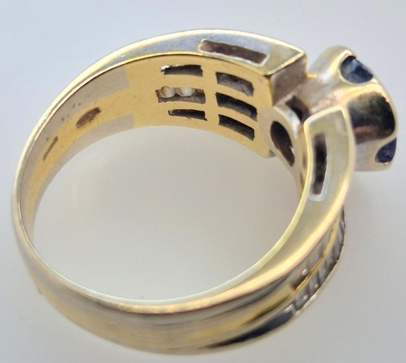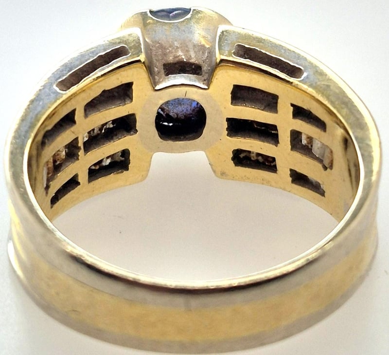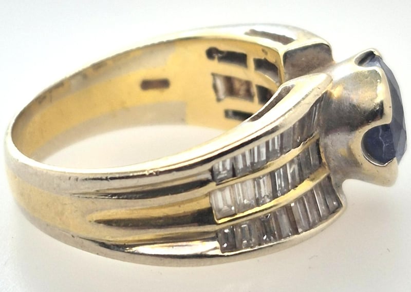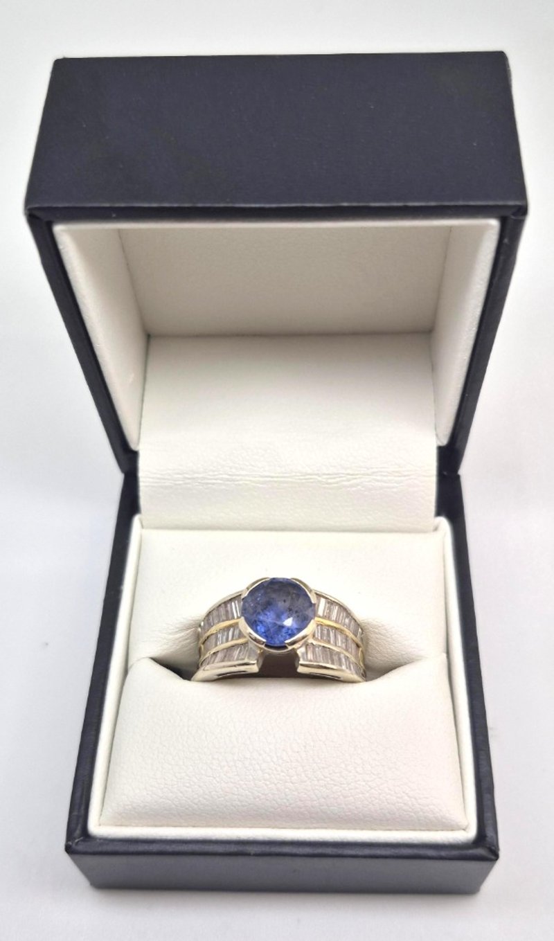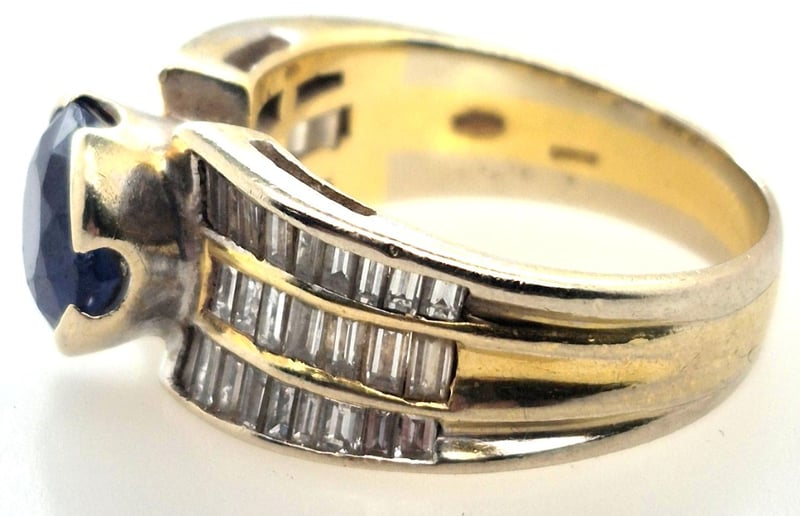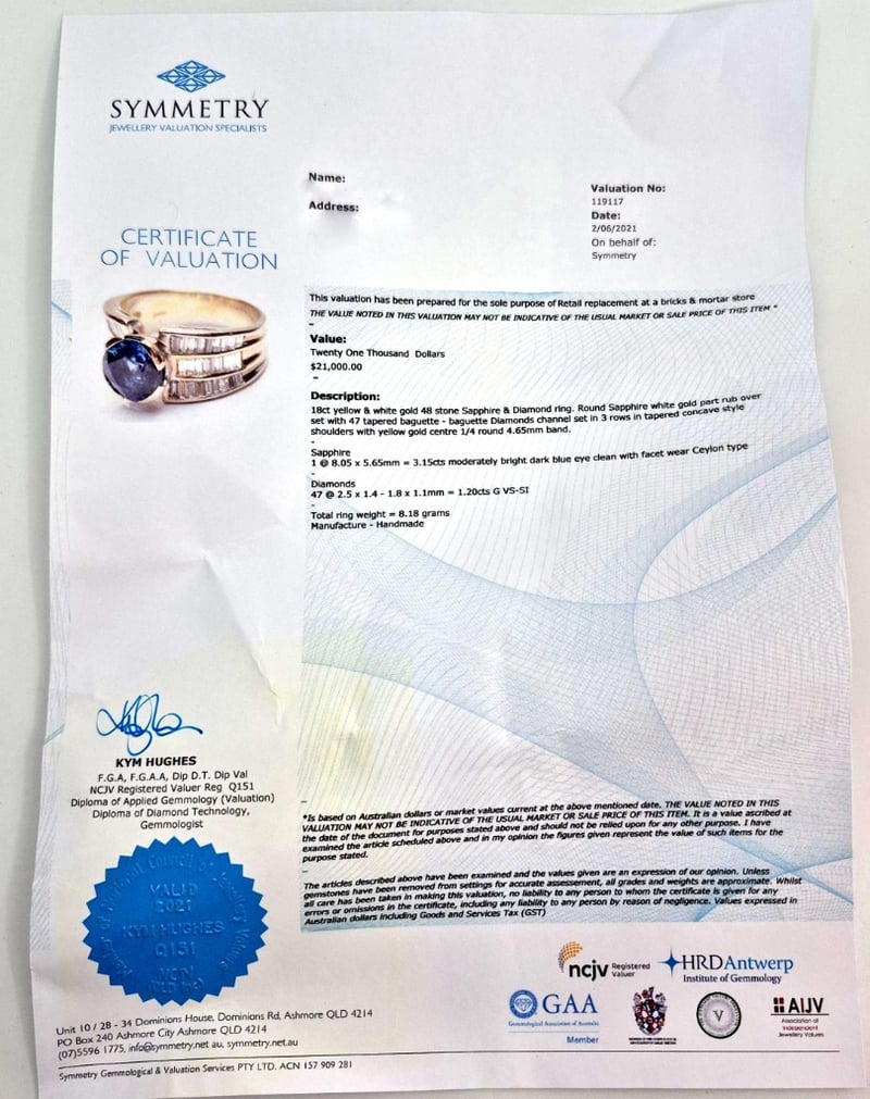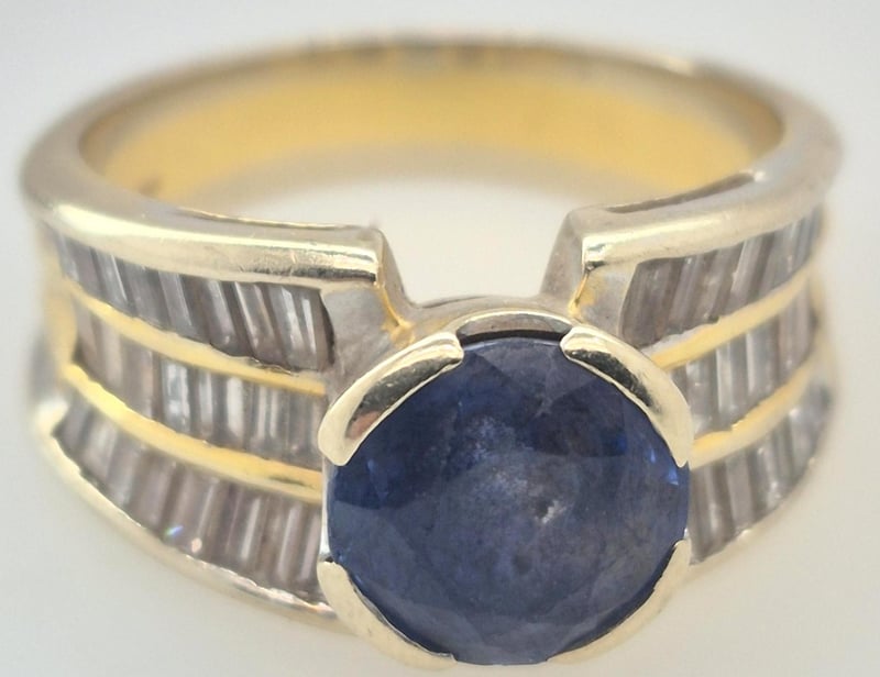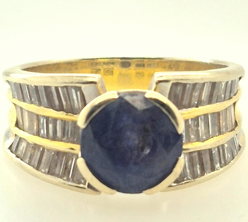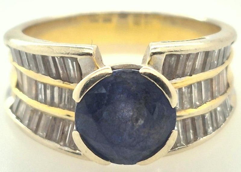 18K YELLOW & WHITE GOLD SAPPHIRE & DIAMOND RINGFeaturing A Round 3.15Cts Sapphire, White Gold Part Rub Over Set With 47 Tapered Baguette - Baguette Diamonds Channel Set In 3 Rows Tapered Concave Style Shoulders With Yellow Gold Centre 1/4 Round 4.65Mm Band. 47 Diamonds @ 2.5 X 1.4 - 1.8 X 1.1 = 1.20Cts Accompanied By Certificate Of AuthenticityTotal Item Weight: 8.18gCondition: Good - Refer To ImagesThis valuation has been conducted by an independent third-party professional. The valuation amount is an assessment by the issuing valuer and does not reflect the auction value of the item.Any inquiries regarding the valuation should be directed to the issuing valuer (refer to contact details on the certificate), as Lloyds Auctions has no affiliation or influence over the valuation, the valuer, or the stated amount.Insurance Replacement Valuation Amount: $21,000.00VAULT587959+1