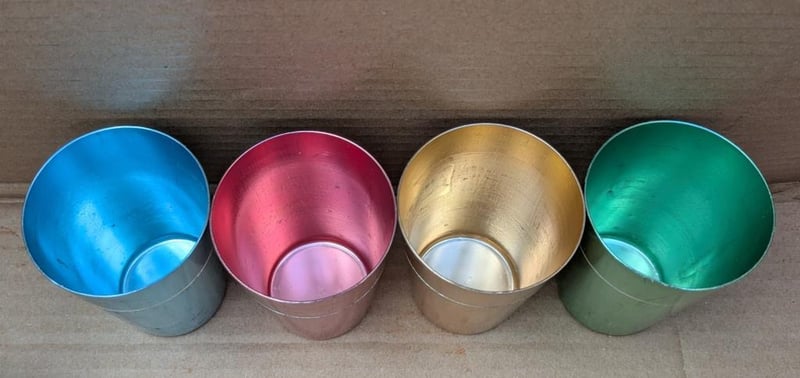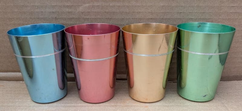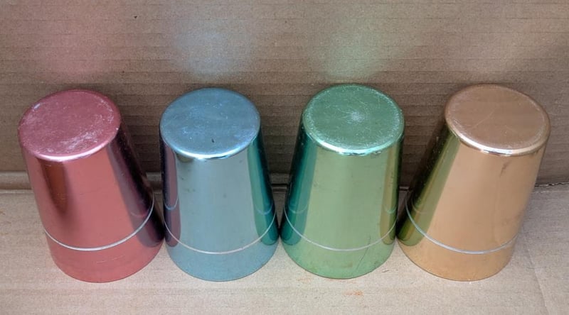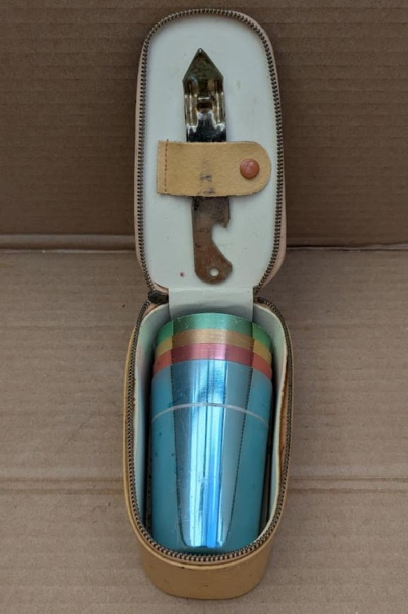 VINTAGE ANODISED 4X DRINKING CUPS WITH BOTTLE OPENER AND CASE MADE IN USA