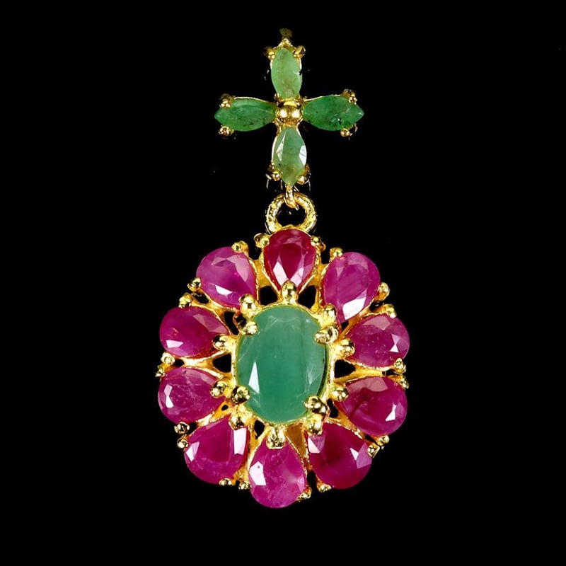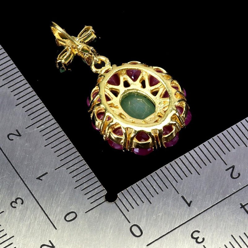 Natural Emerald & Ruby Pendant. Made In Solid Sterling Silver And Plated In14K Yellow Gold. Features Natural Red Rubies And Natural Green Emeralds. Pendant Measures 33X18Mm.