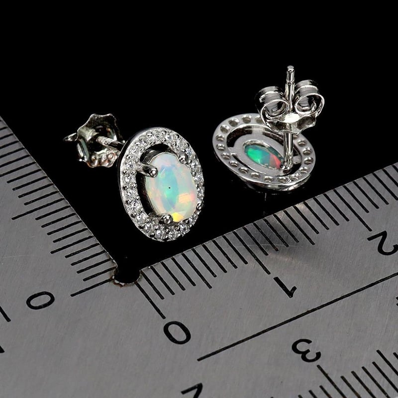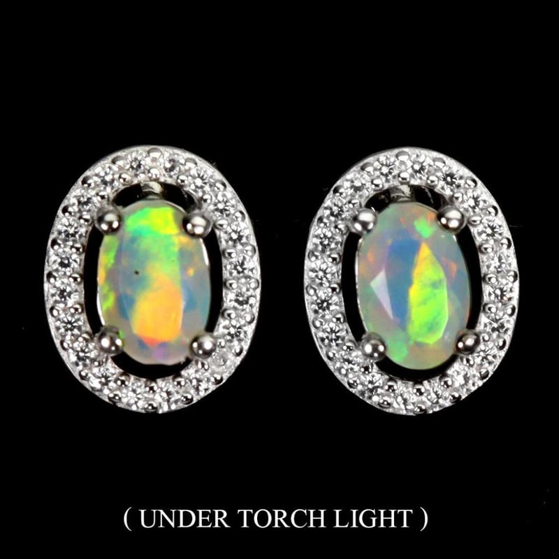 NATURAL RAINBOW FIRE OPAL EARRINGS. Natural Rainbow Fire Opal Earrings. Made In Solid Sterling Silver And Plated In 14K White Gold. Features Natural Rainbow Fire Opal Surrounded By Sparkling Czs. Earrings Measure 10X8Mm Condition: Good - Refer Images 0488515+22