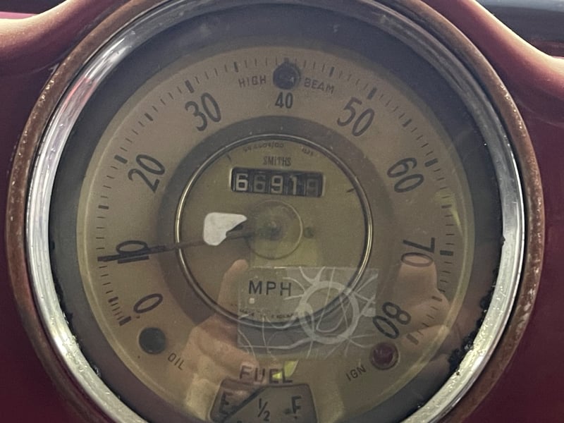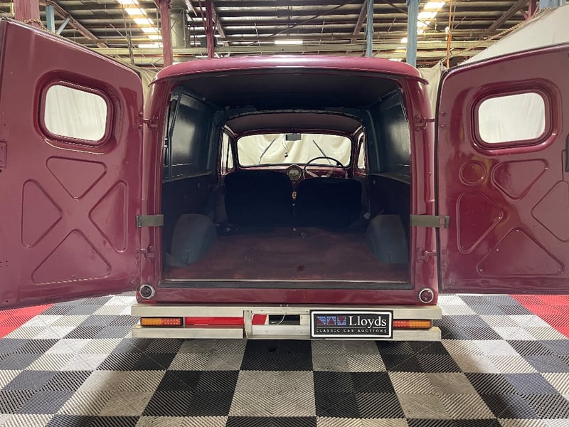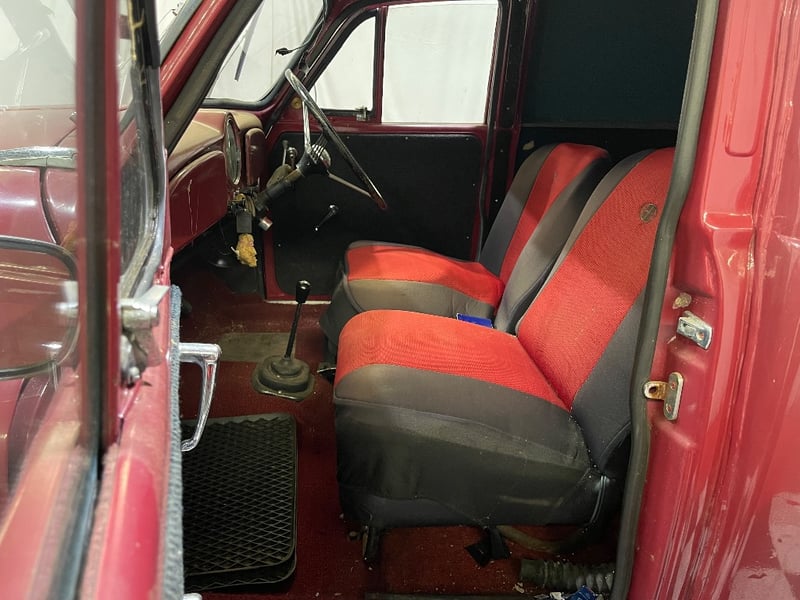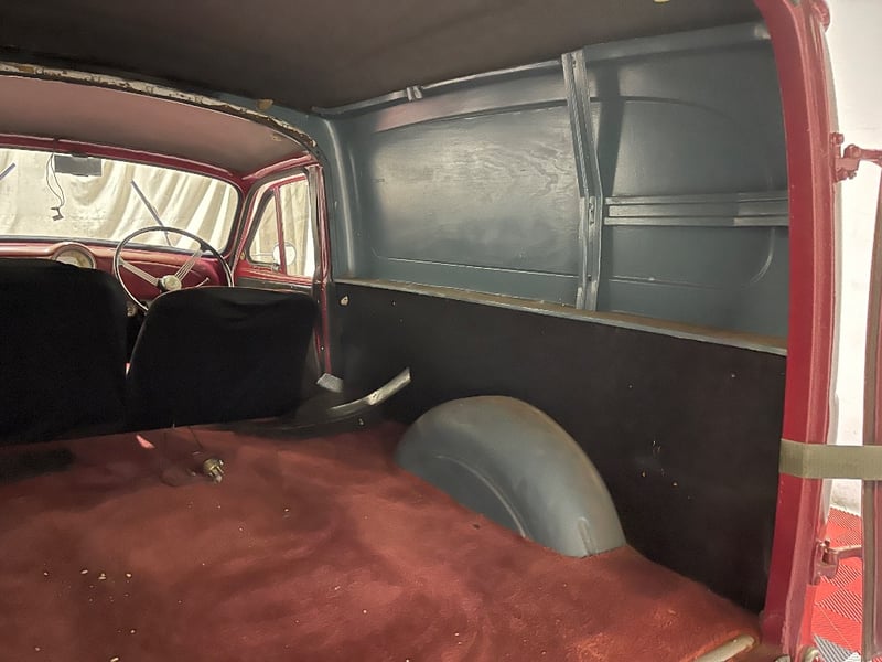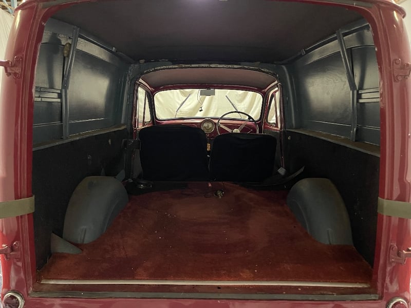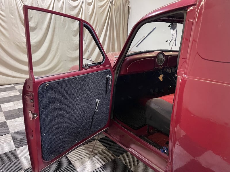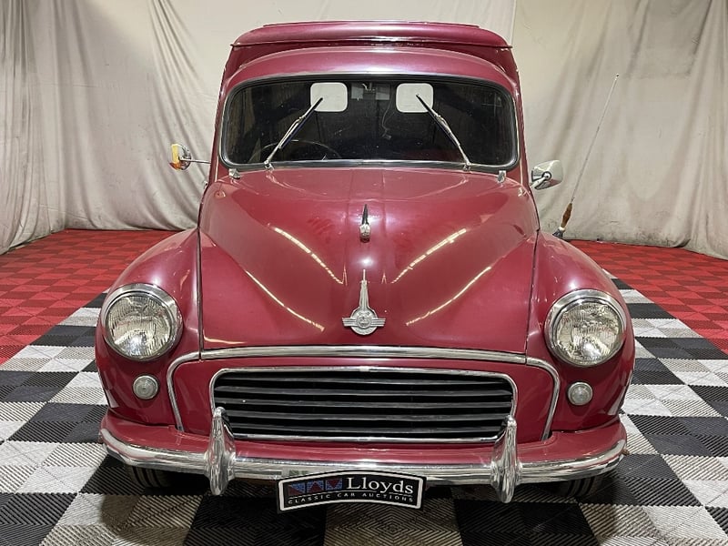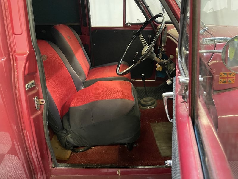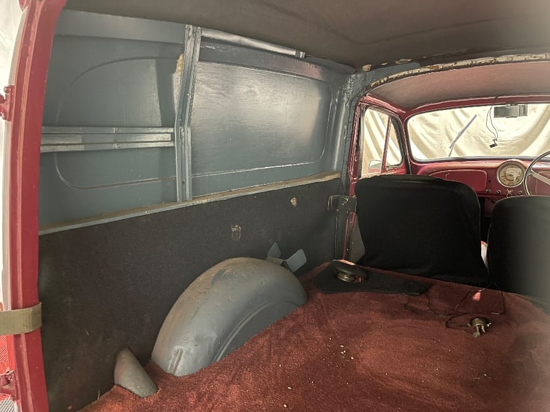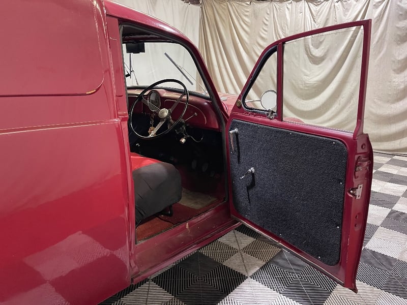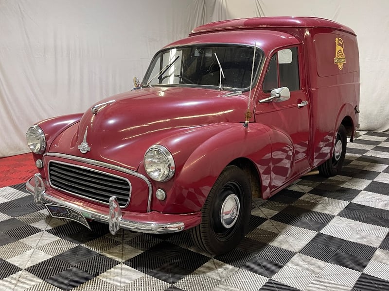 1959 Morris Minor two‑door panel van finished in Red. Powered by a 0.9‑litre inline‑four petrol engine paired with a manual transmission. Odometer indicating 66,872 miles. Seating for two occupants.