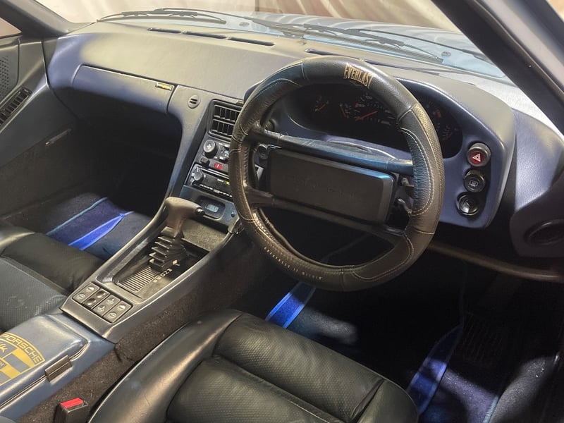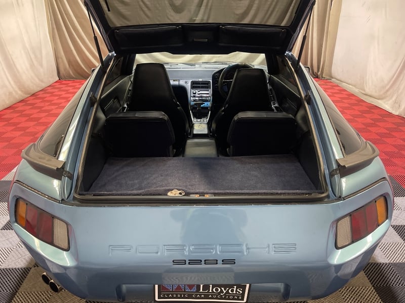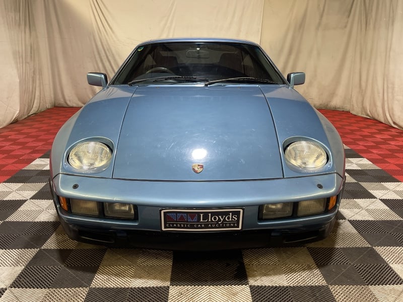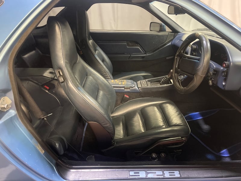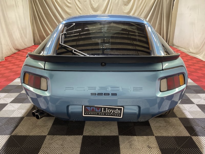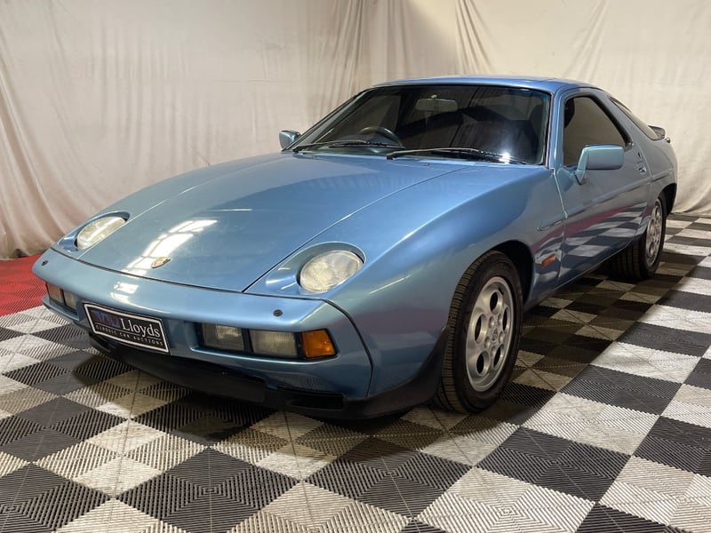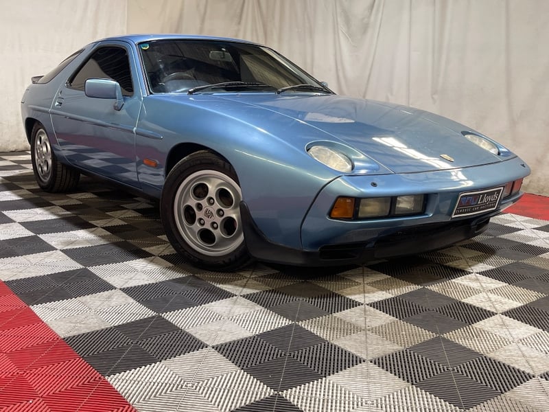 1985 Porsche 928 two‑door coupe finished in Blue. Rear‑wheel drive configuration powered by a 5.0‑litre V8 petrol engine paired with an automatic transmission. Odometer indicating 217,346 kilometres. Seating for four occupants.