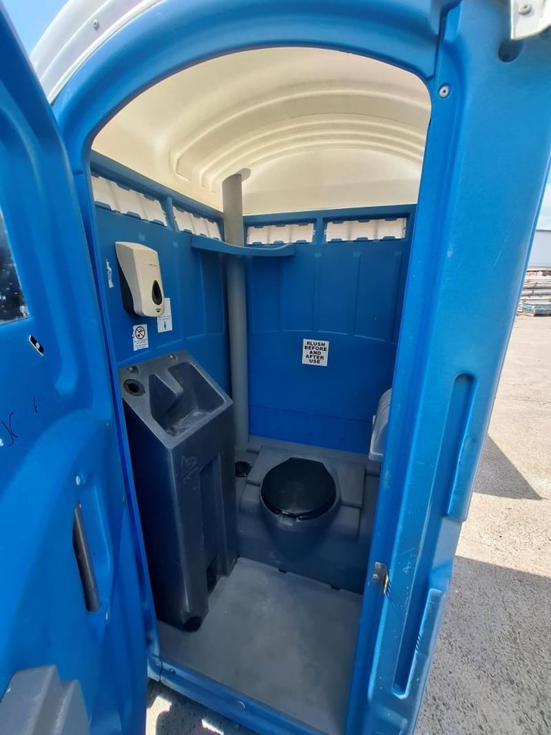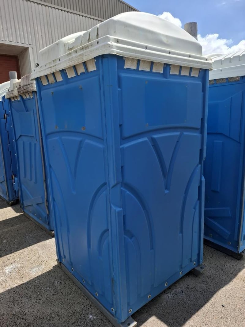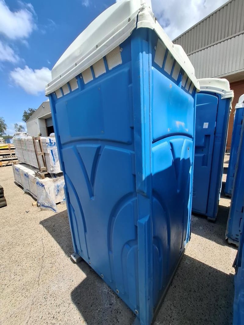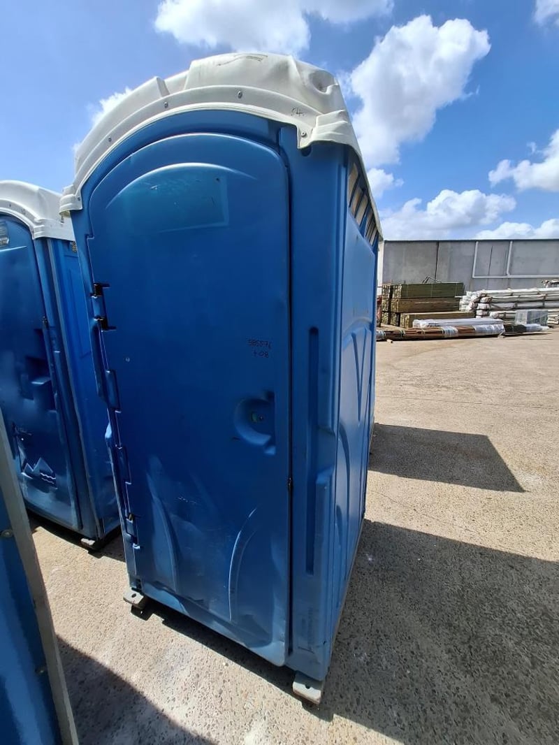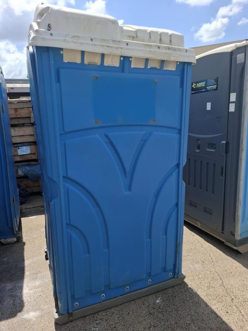 Portable Toilet Description: Ex rental toilet, unknown working condition. Note: Some damage, plastic cracked, contains water
