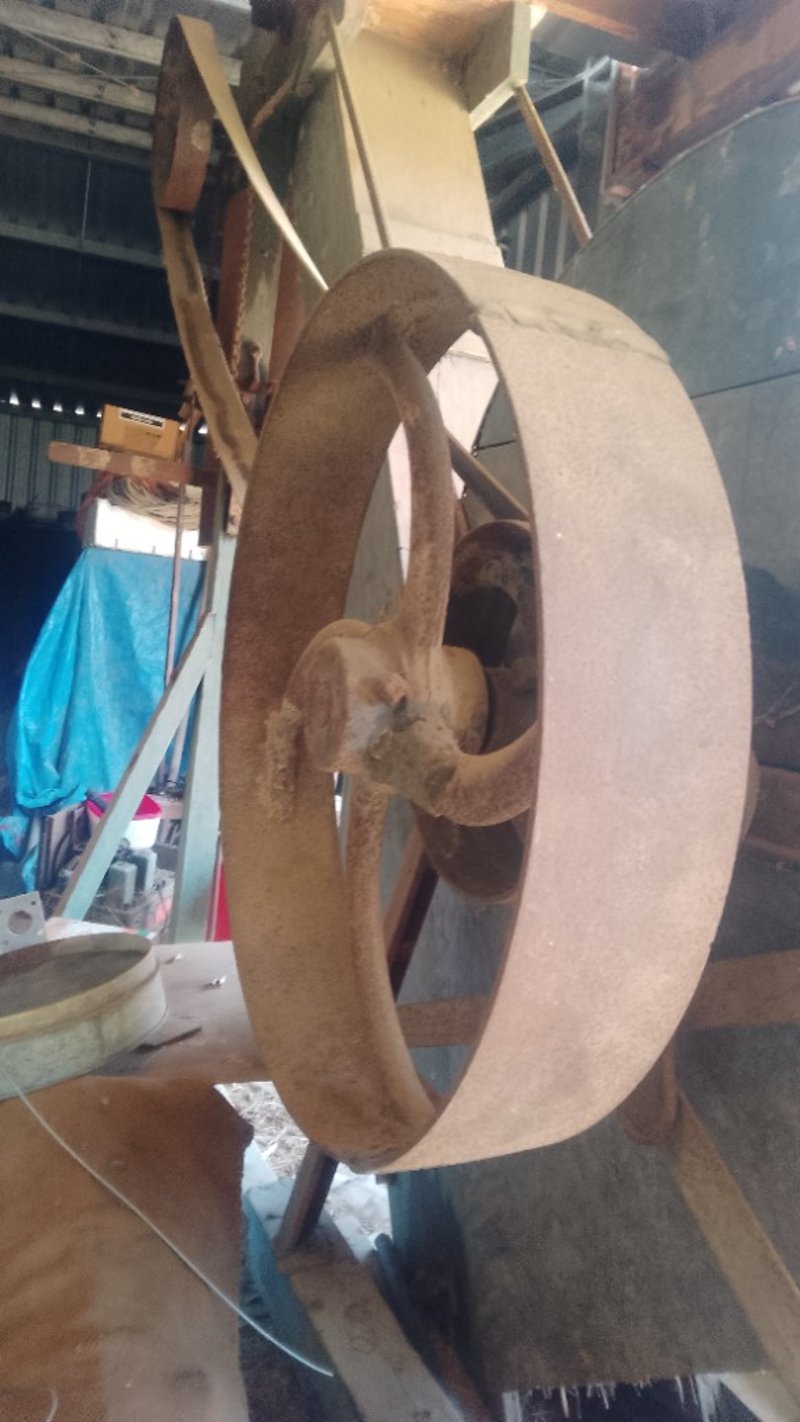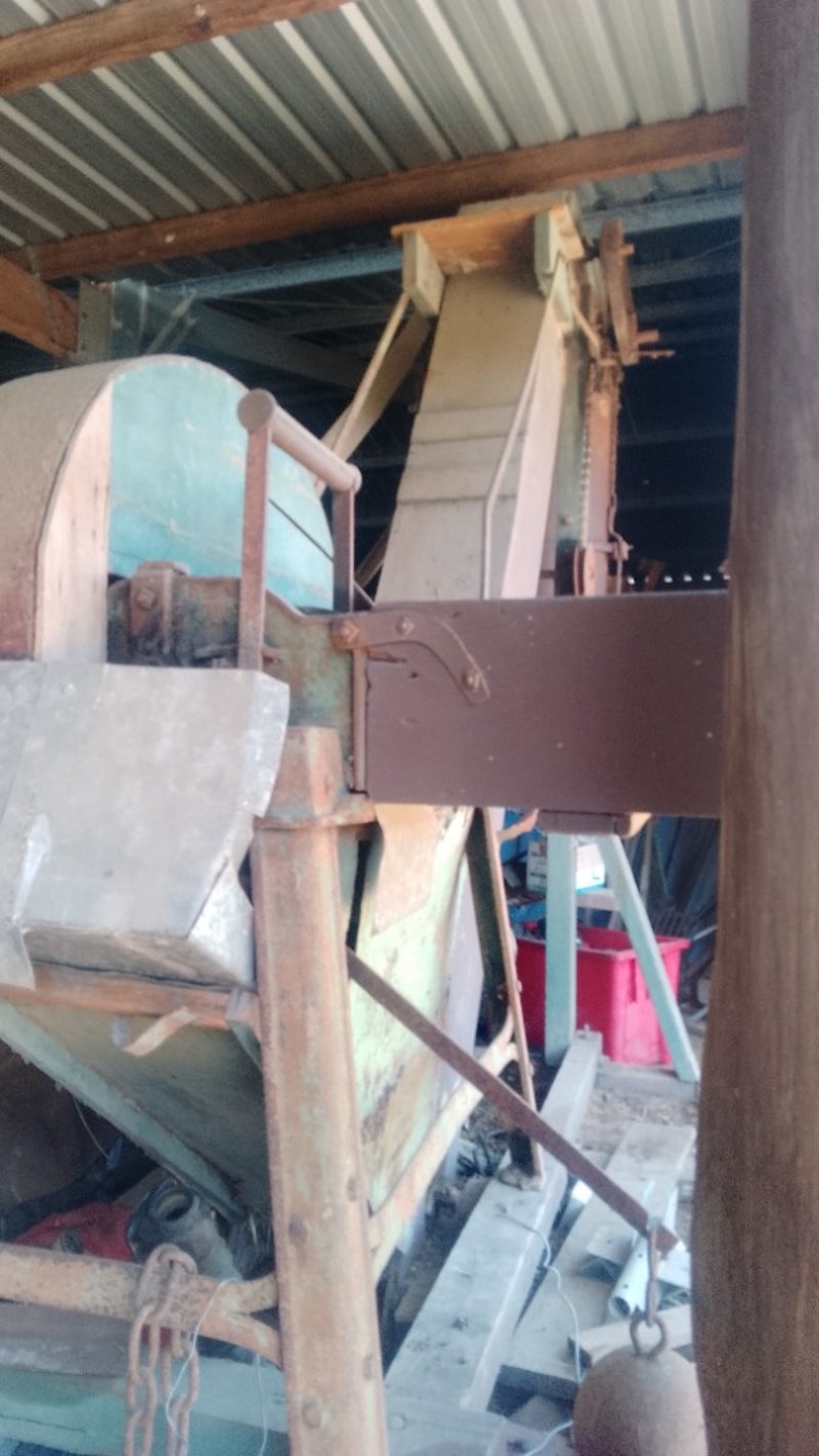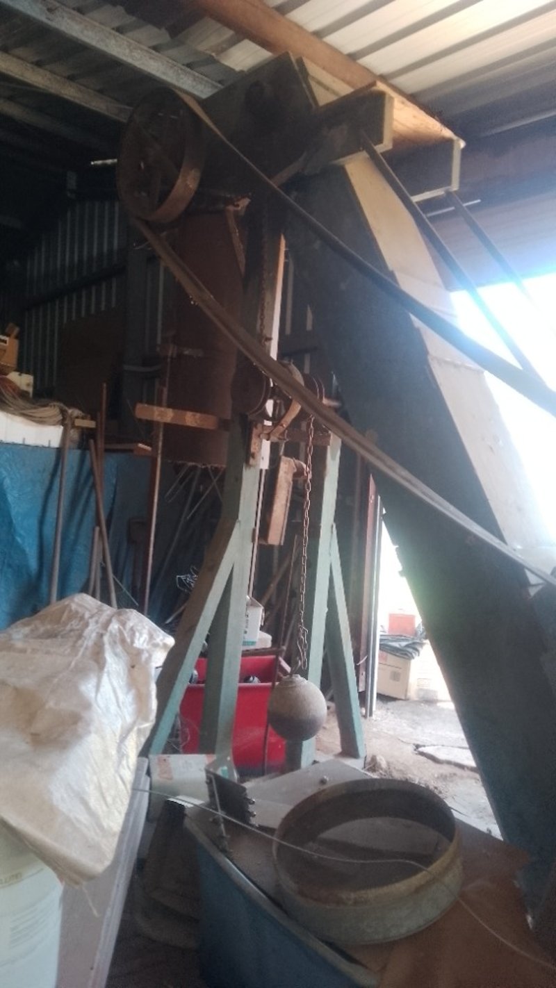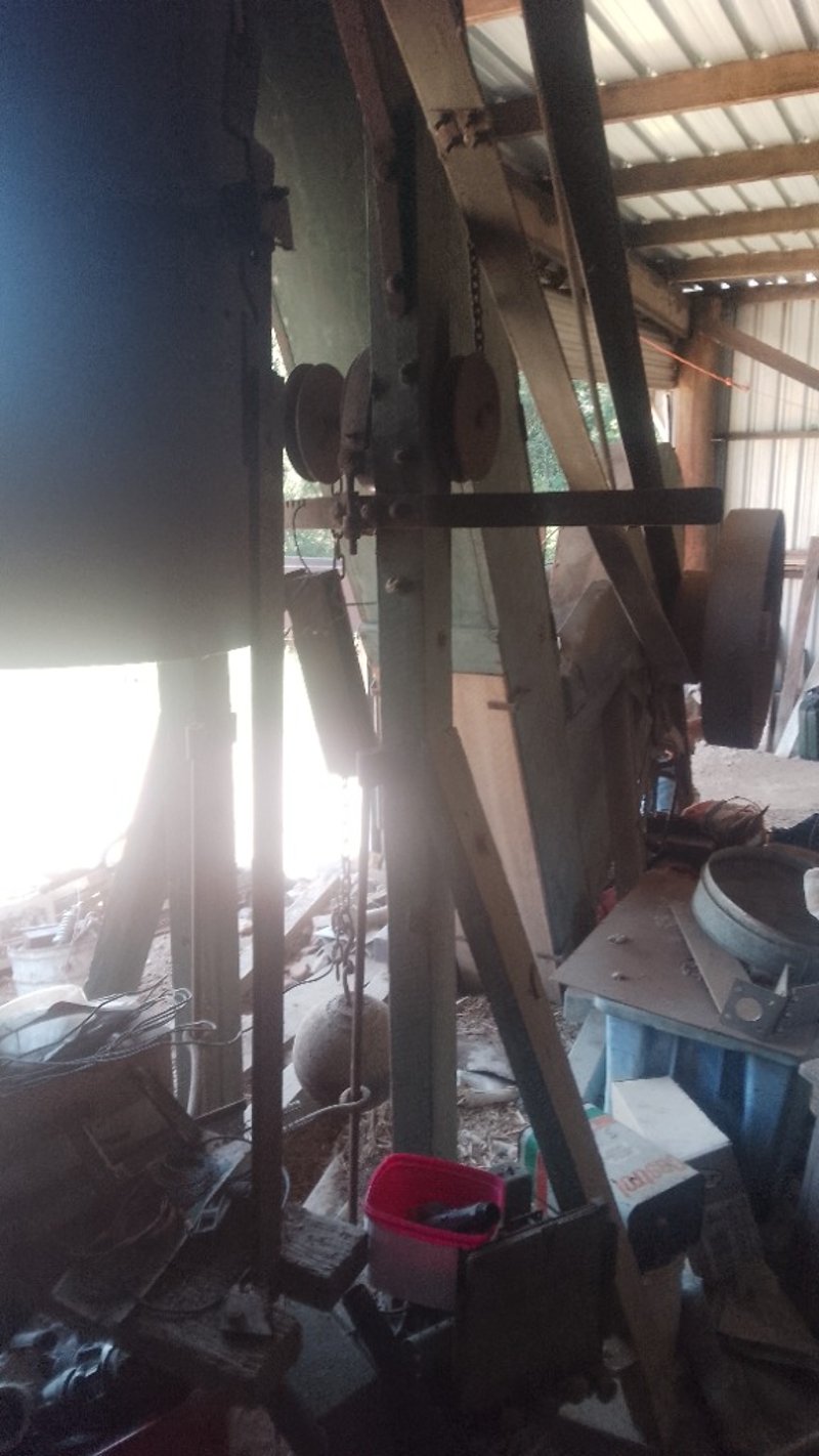 Notes / Extras: Belt driven grain mill assembly, bucket elevator system, feed hopper, flywheel drive, steel support frame and chute components.