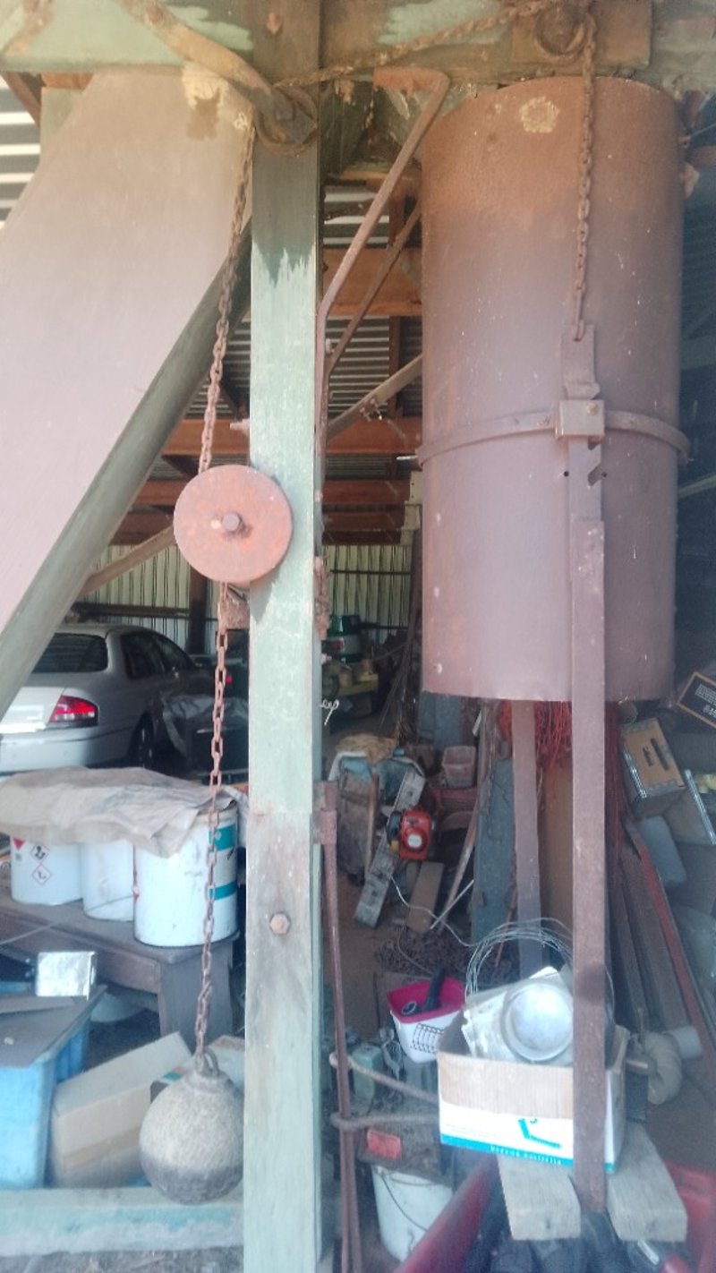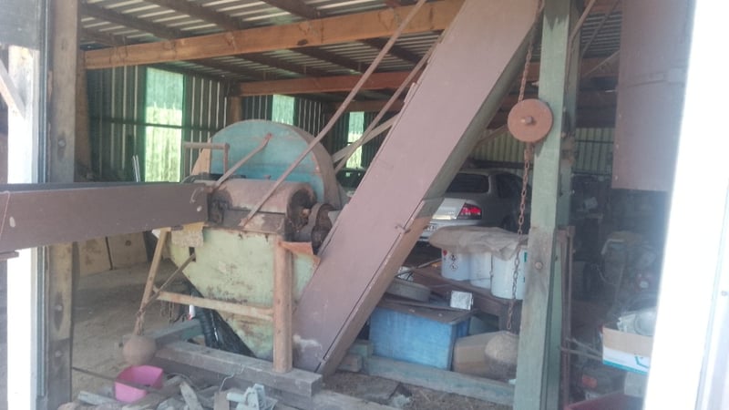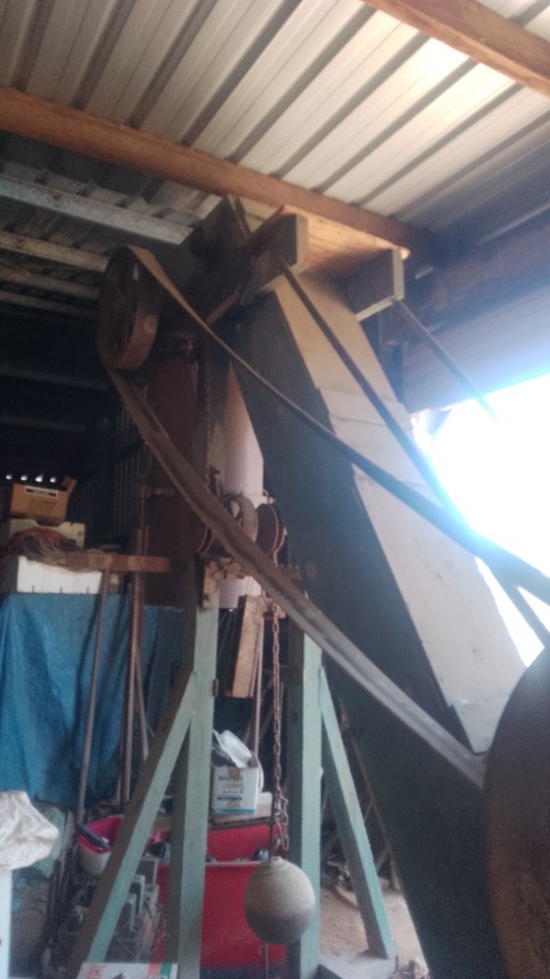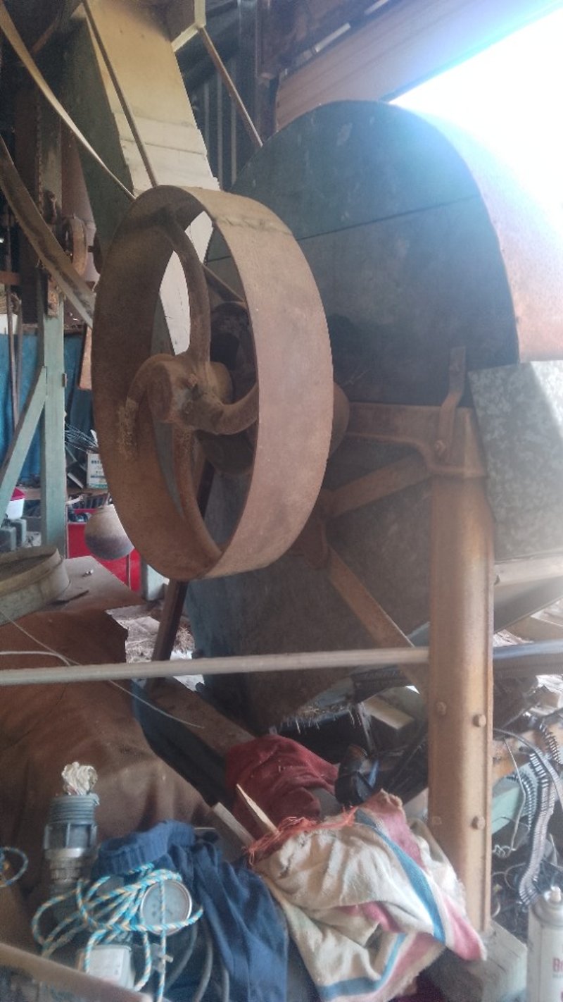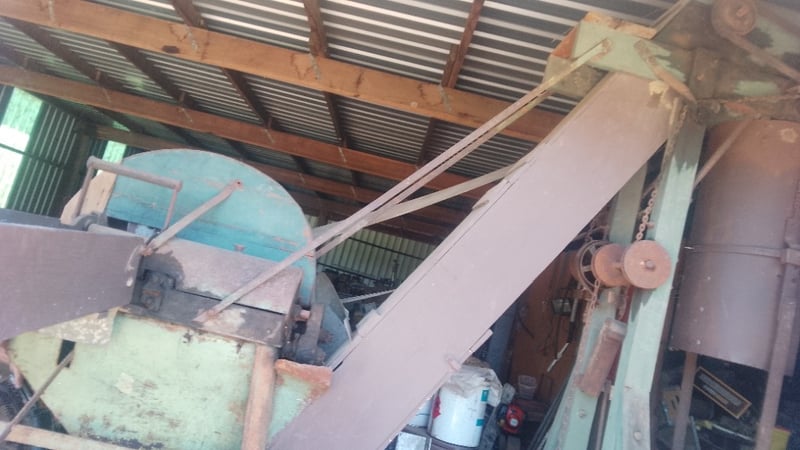 Notes / Extras: Belt driven grain mill assembly, bucket elevator system, feed hopper, flywheel drive, steel support frame and chute components.