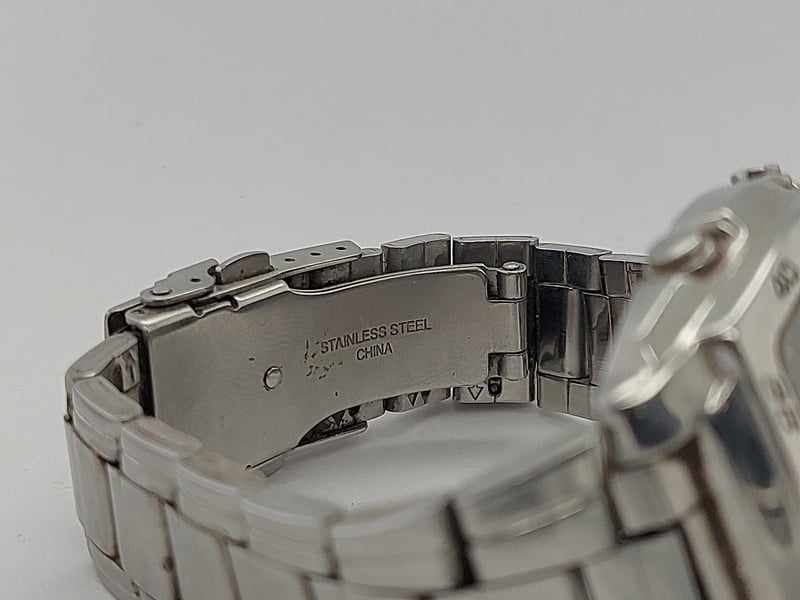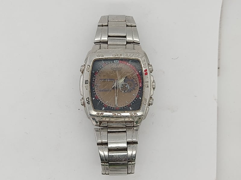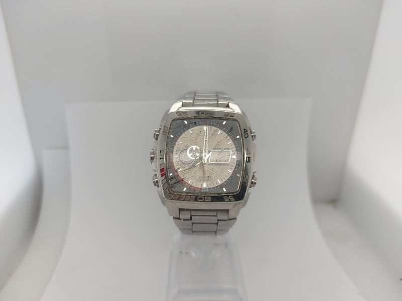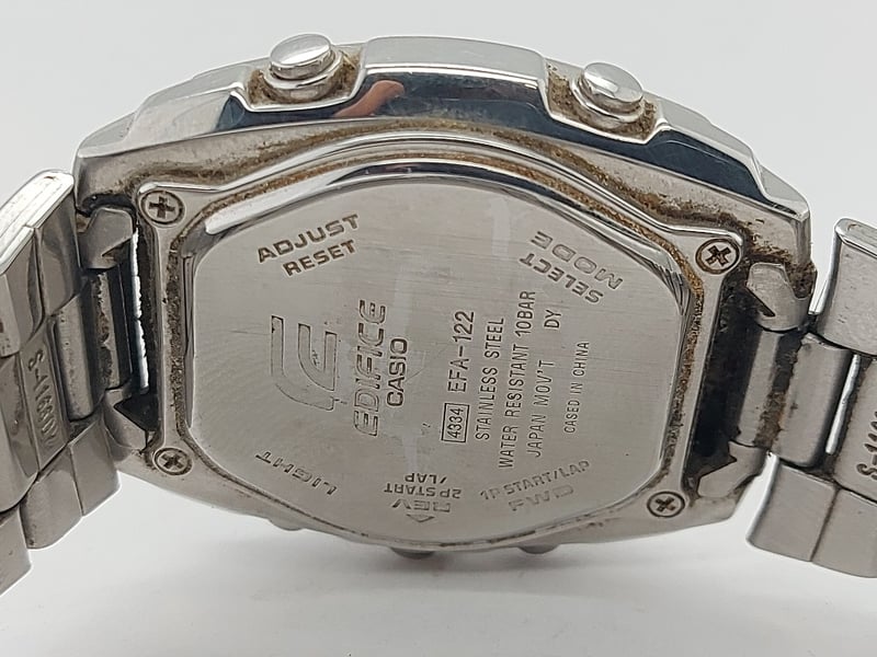 VASIO 4334EFA-122 S-1166DY 2006 REFERENCE NO. S-1166DYPRODUCTION YEAR: 2006DIAL: ANALOG - DIGITALCASE DESCRIPTION: SQUARE, STAINLESS STEEL CASE, WATER RESISTANTCASE SIZE: 44.9MMD×40MMW×11CMHBRACELET: STANLESS STEEL LINKSMOVEMENT: JAPANESE QUARTS MOVT DVBOX: NOT INCLUDEDPAPERS: NOT INCLUDEDCondition: Poor - Refer To ImagesTOORMINA548651+2