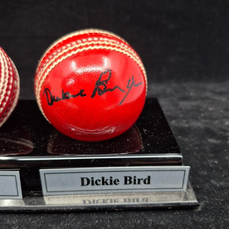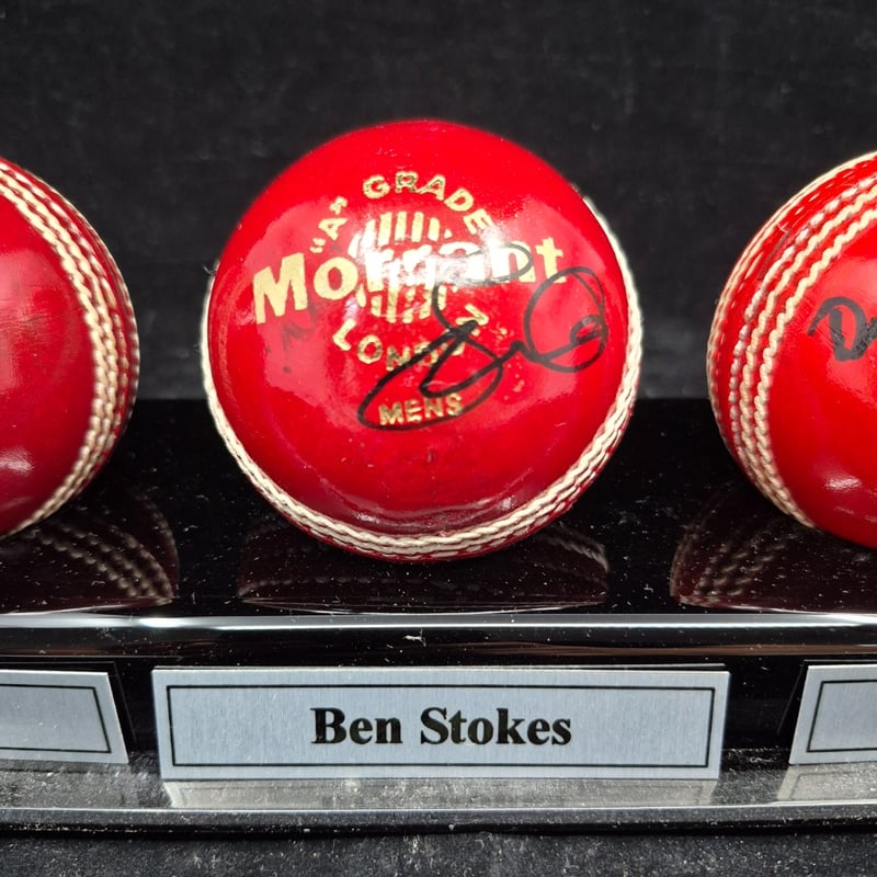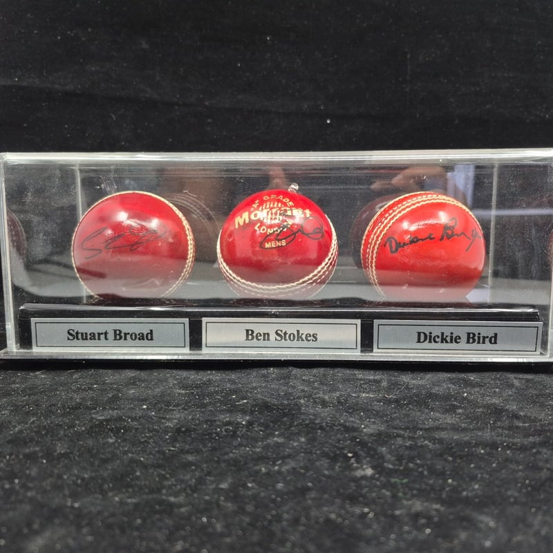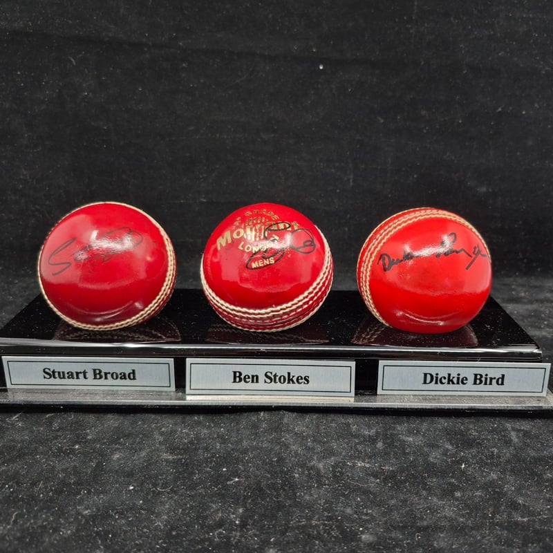 TRIO OF CRICKET BALLS SIGNED BY STUART BROAD, BEN STOKES & DICKIE BIRD