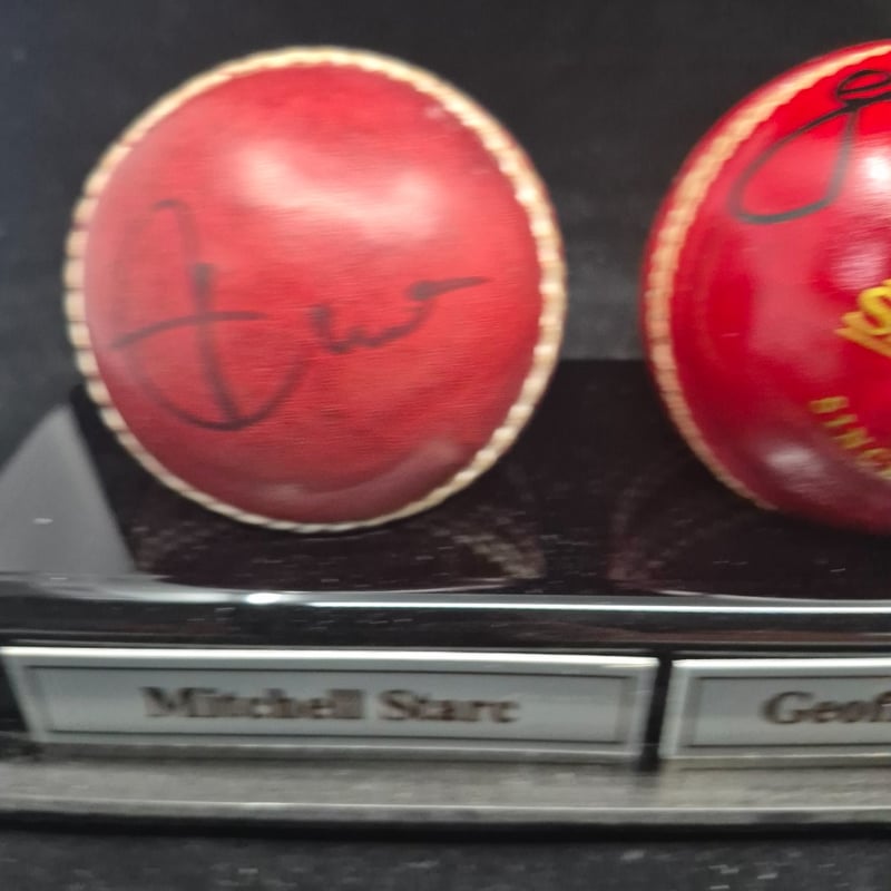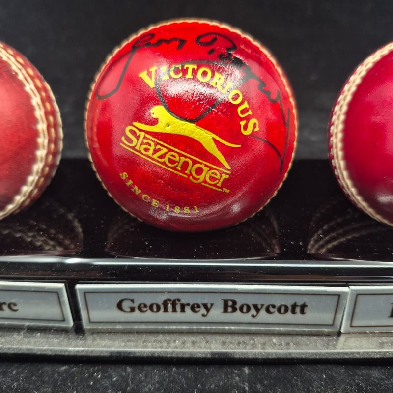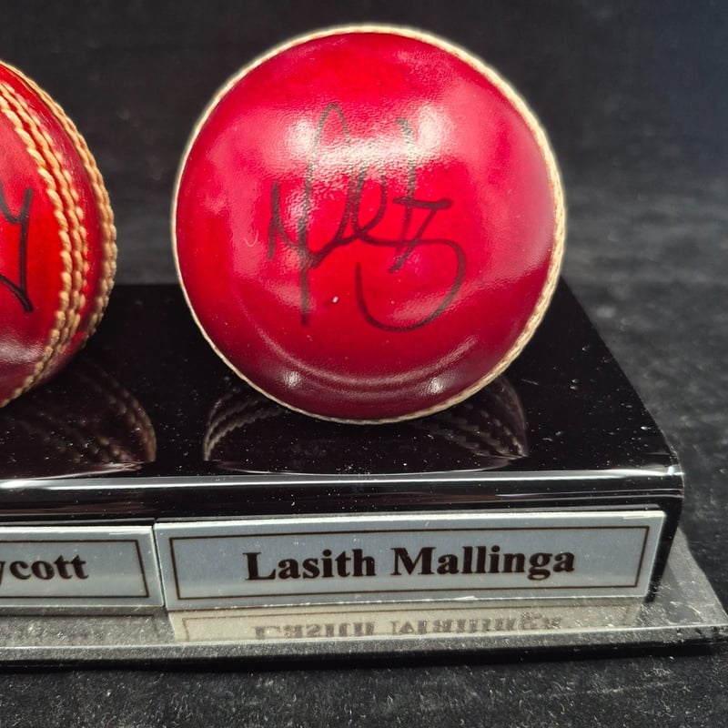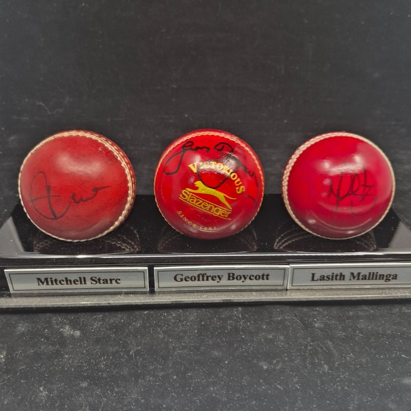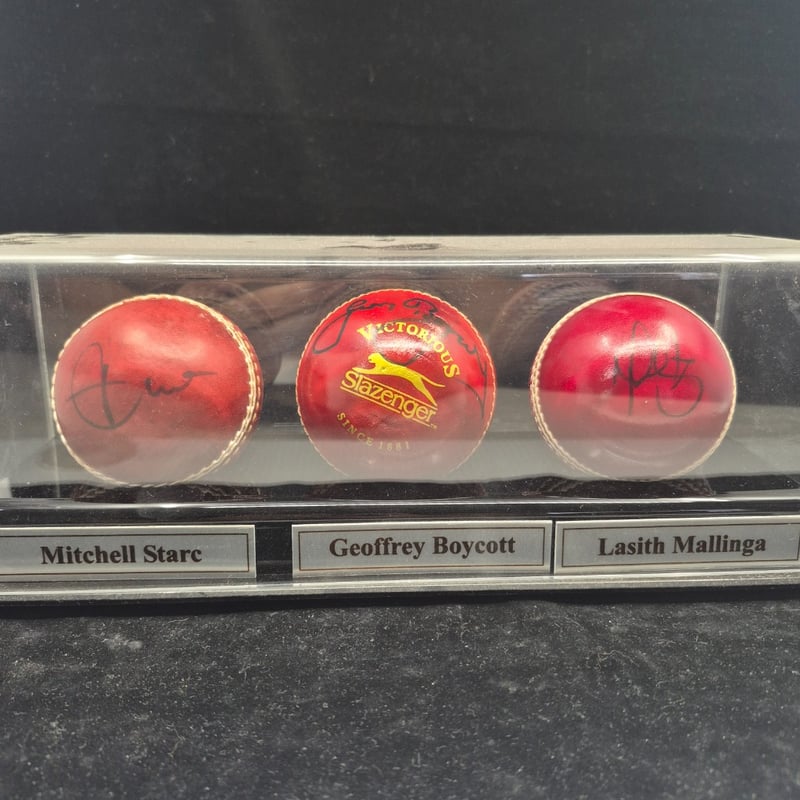 TRIO OF CRICKET BALLS SIGNED BY MITCHELL STARE, GEOFFREY BOYCOTT & LASITH MALLINGA