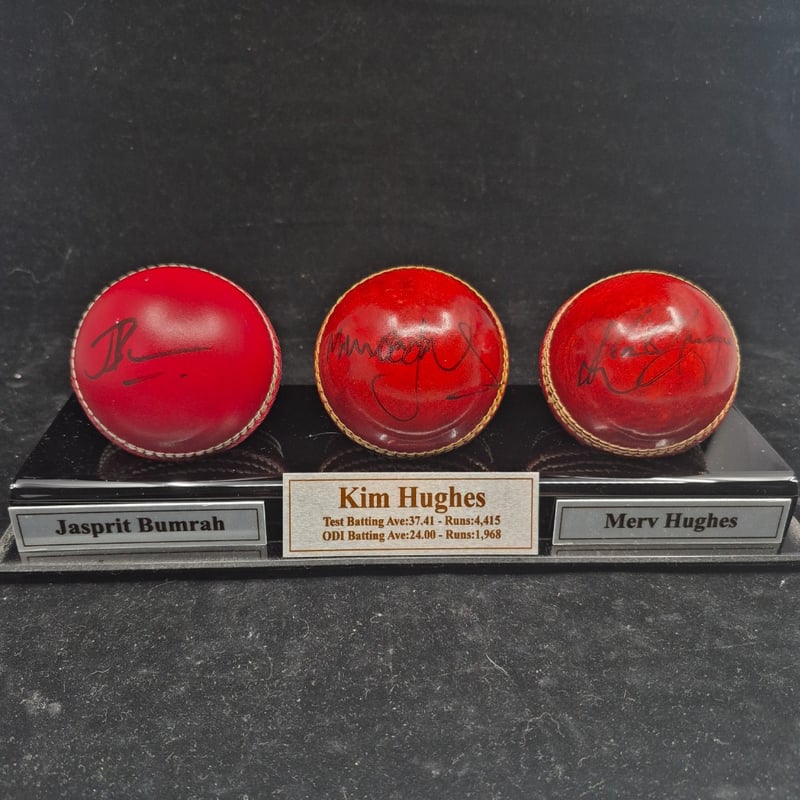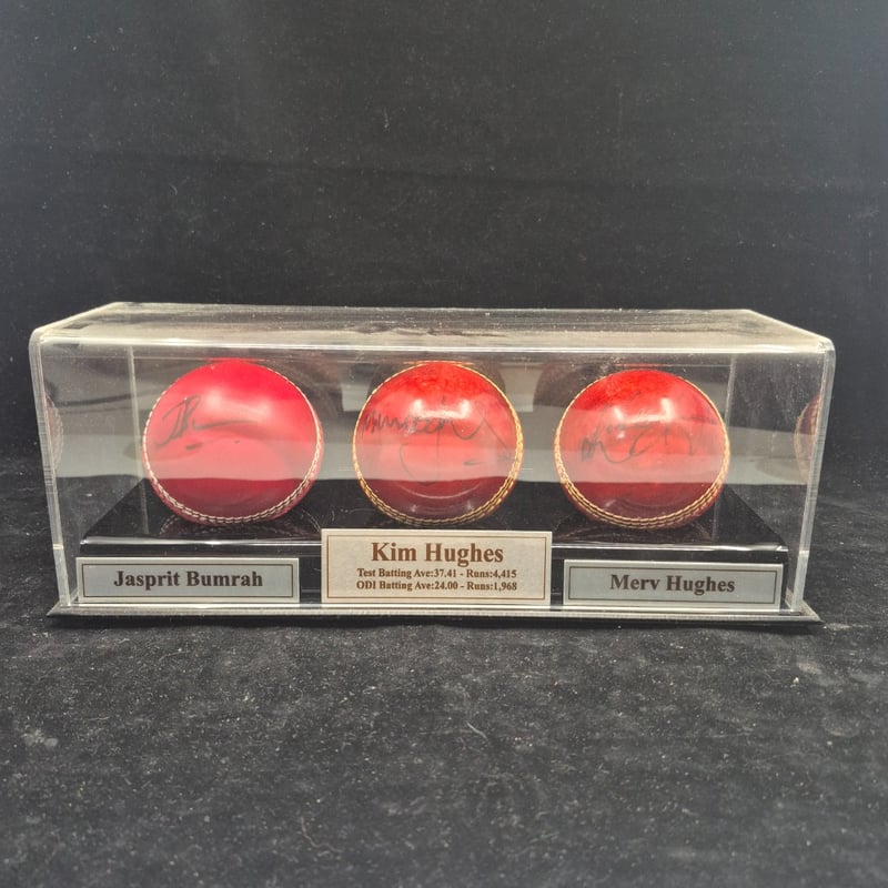 TRIO OF CRICKET BALLS SIGNED BY JASPRIT BUMRAH, KIM HUGHES & MERV HUGHES Condition: Good - Refer To Images 587894+52