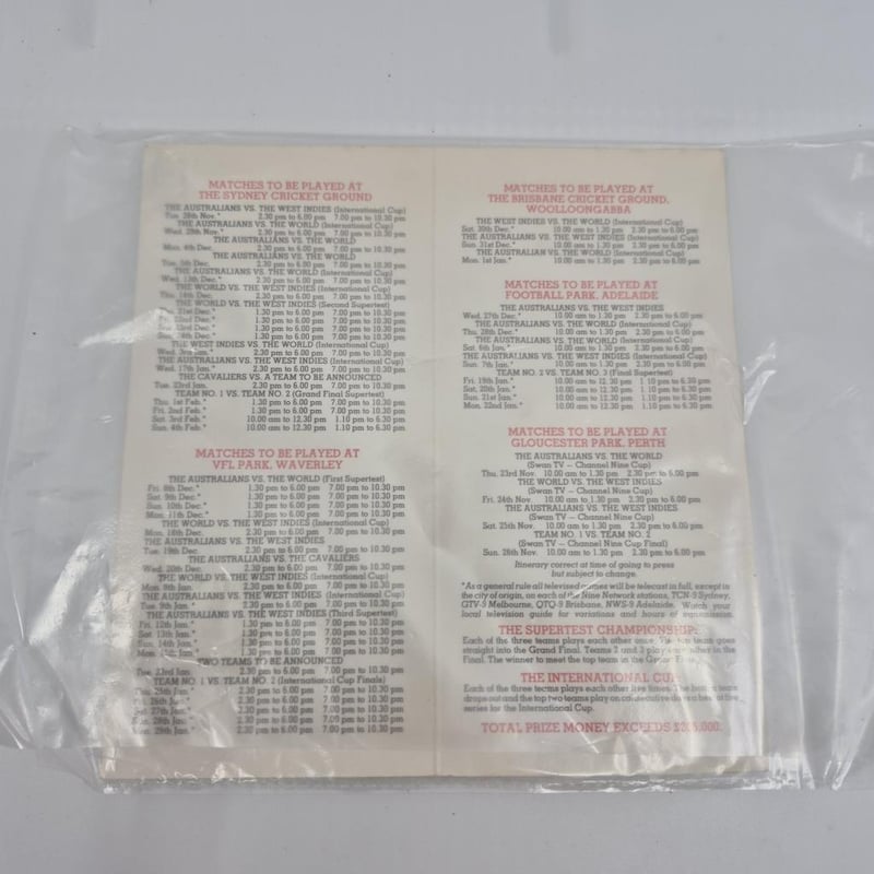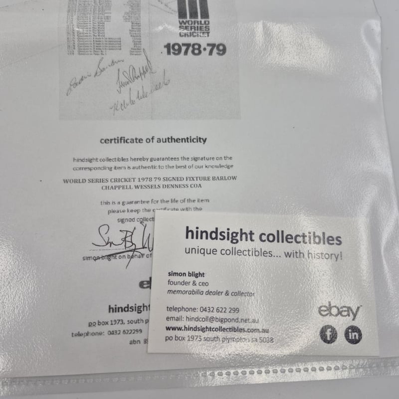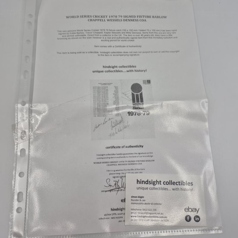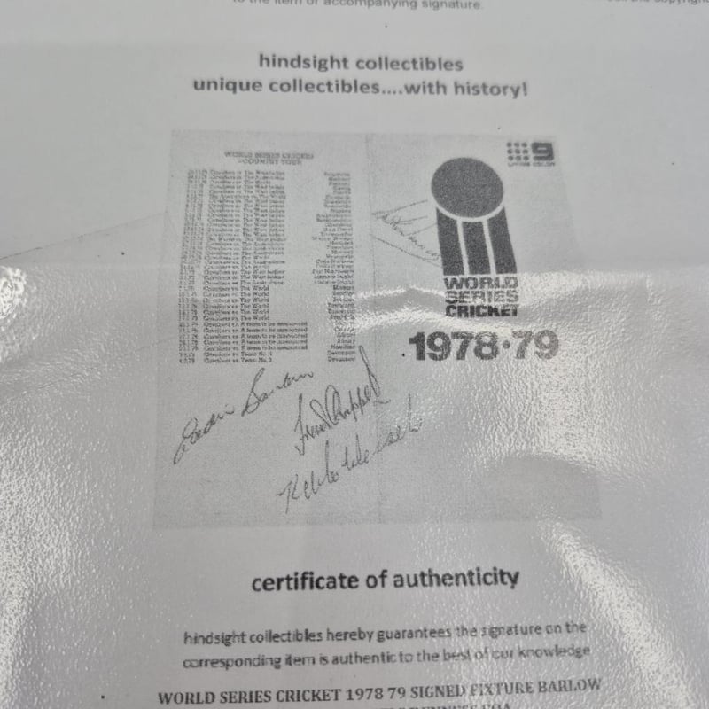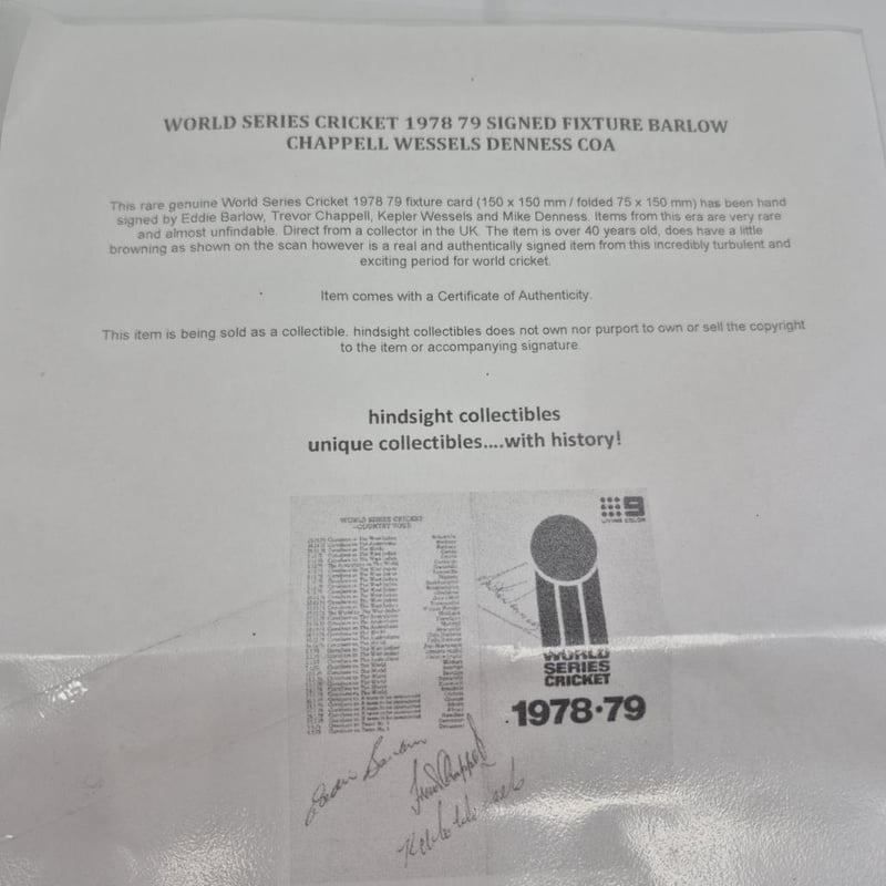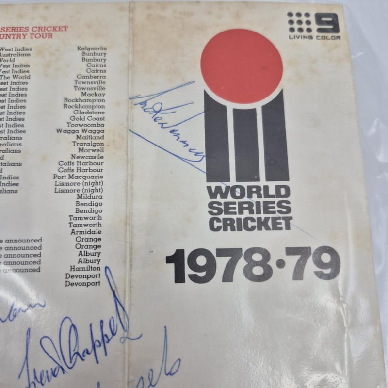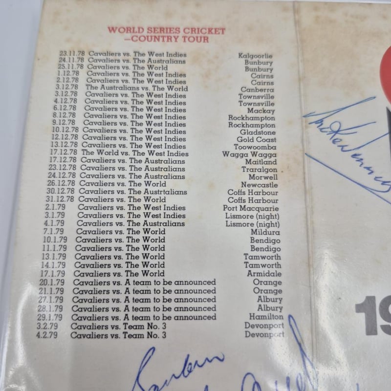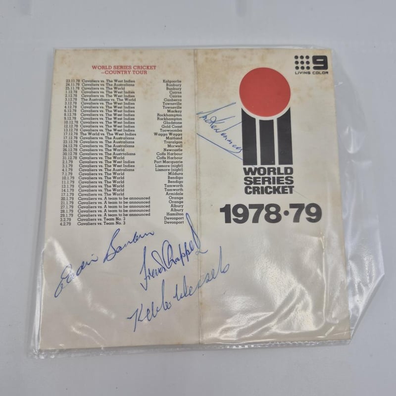 WORLD SERIES CRICKET 1978 79 SIGNED FIXTURE BY BARLOW. CHAPPELL, WESSELS & DENNIS + COA