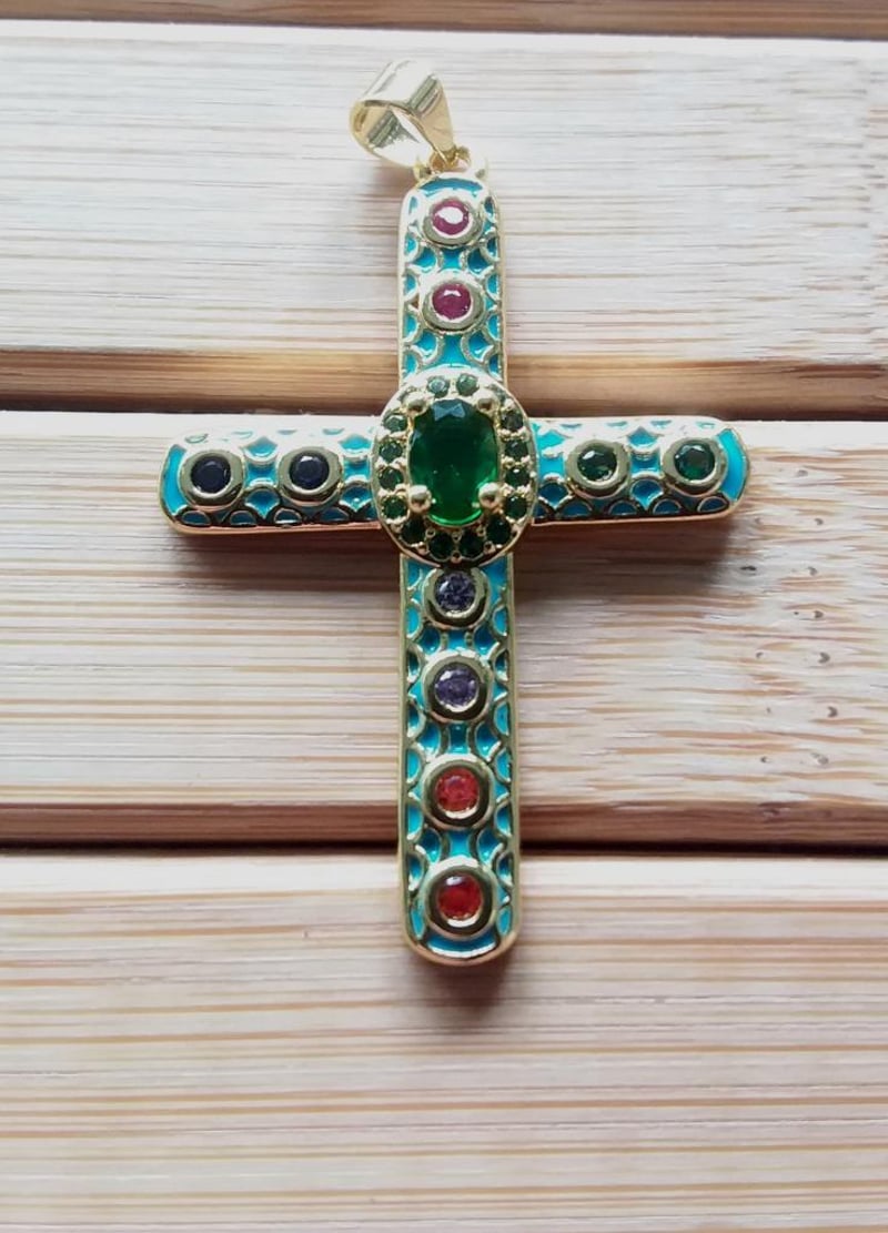 GOLD PLATED ENAMEL CROSS PENDANT WITH COLOURED CRYSTALS