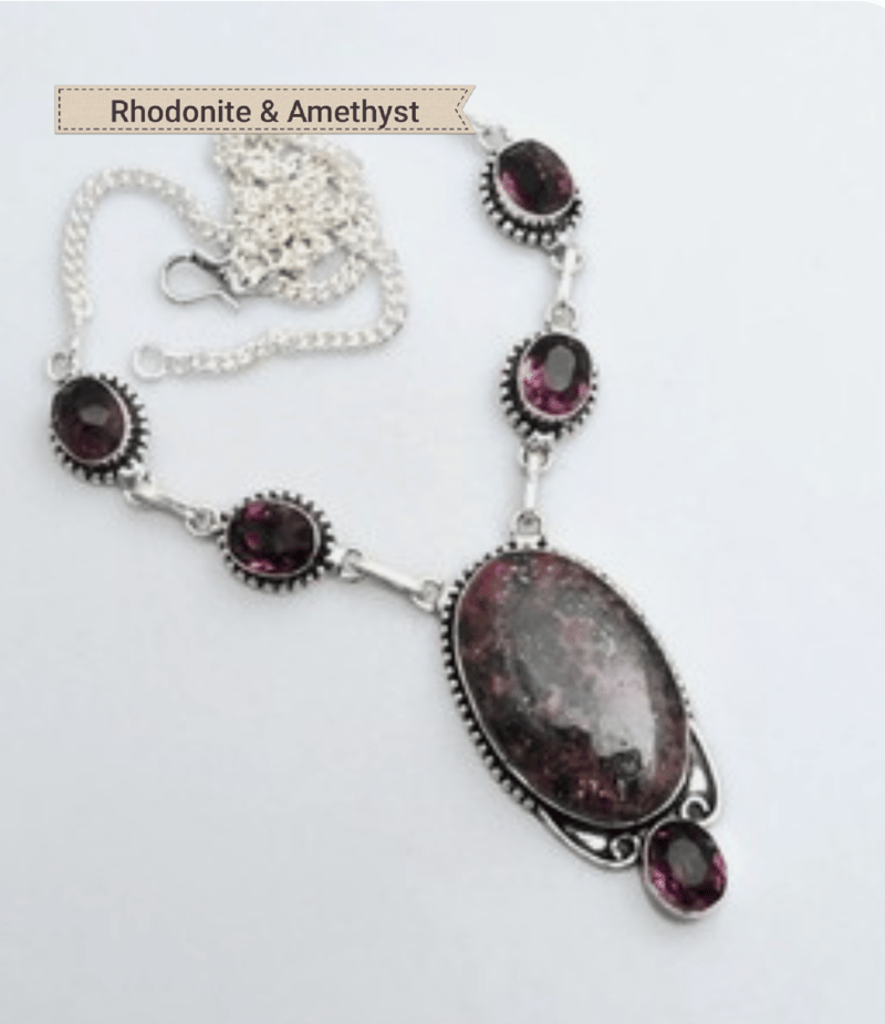 925 SILVER WITH AMETHYST AND RHODONITE GEMSTONES ETHNIC STYLE NECKLACE