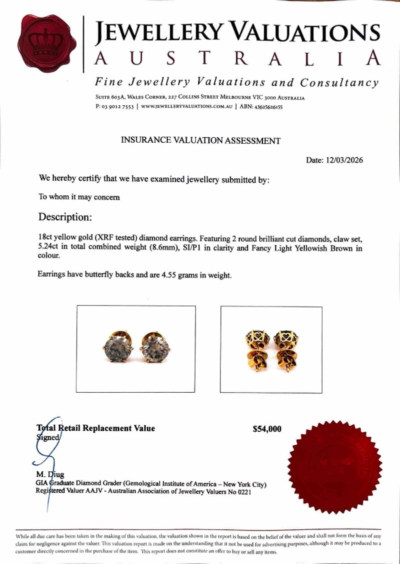 18CT YELLOW GOLD (XRF TESTED) DIAMOND EARRINGSFeaturing 2 Round Brilliant Cut Diamonds, Claw Set, 5.24Ct In Total Combined Weight (8.6Mm), Si/P1 In Clarity And Fancy Light Yellowish Brown In Colour.Earrings Have Butterfly Backs And Are 4.55 Grams In Weight.Condition: Good - Refer To ImagesThis valuation has been conducted by an independent third-party professional. The valuation amount is an assessment by the issuing valuer and does not reflect the auction value of the item.Any inquiries regarding the valuation should be directed to the issuing valuer (refer to contact details on the certificate), as Lloyds Auctions has no affiliation or influence over the valuation, the valuer, or the stated amount.Insurance Replacement Valuation Amount: $54,000.00163083+12