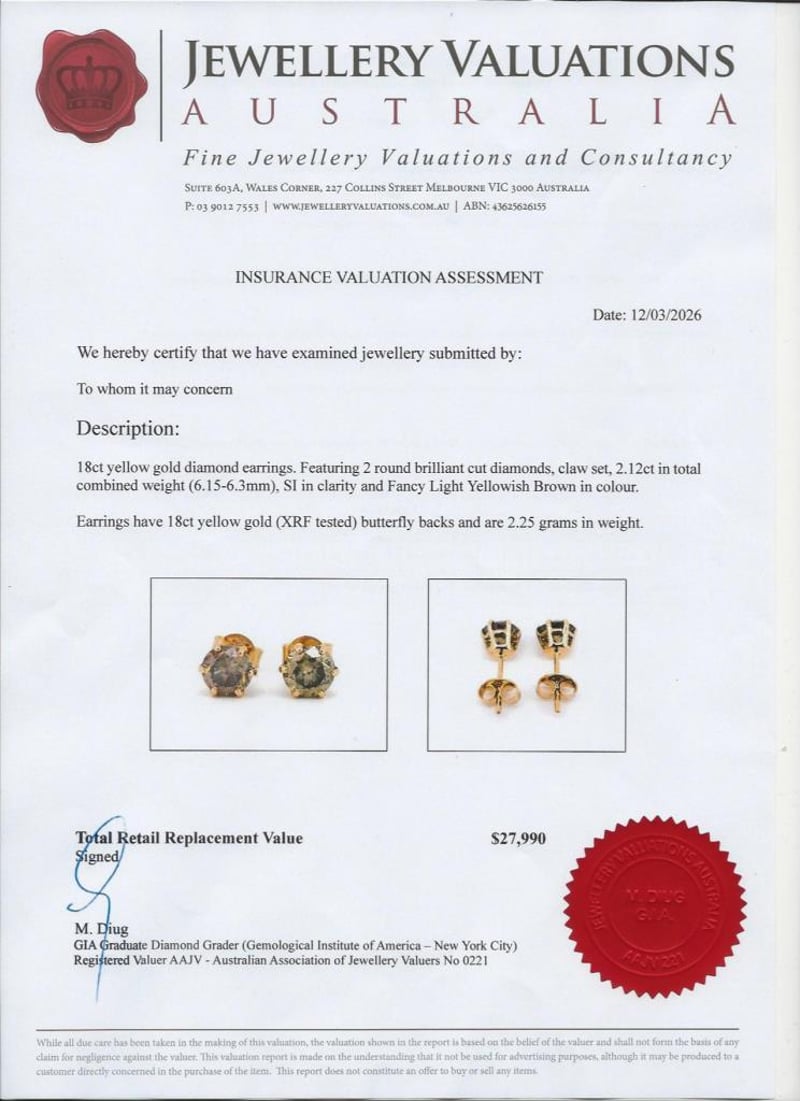 18CT YELLOW GOLD DIAMOND EARRINGS Featuring 2 Round Brilliant Cut Diamonds, Claw Set, 2.12Ct In Total Combined Weight (6.15-6.3Mm), Si In Clarity And Fancy Light Yellowish Brown In Colour. Earrings Have 18Ct Yellow Gold (Xrf Tested) Butterfly Backs And Are 2.25 Grams In Weight. Condition: Good - Refer To Images This valuation has been conducted by an independent third-party professional. The valuation amount is an assessment by the issuing valuer and does not reflect the auction value of the item. Any inquiries regarding the valuation should be directed to the issuing valuer (refer to contact details on the certificate), as Lloyds Auctions has no affiliation or influence over the valuation, the valuer, or the stated amount. Insurance Replacement Valuation Amount: $27,990.00 163083+14
