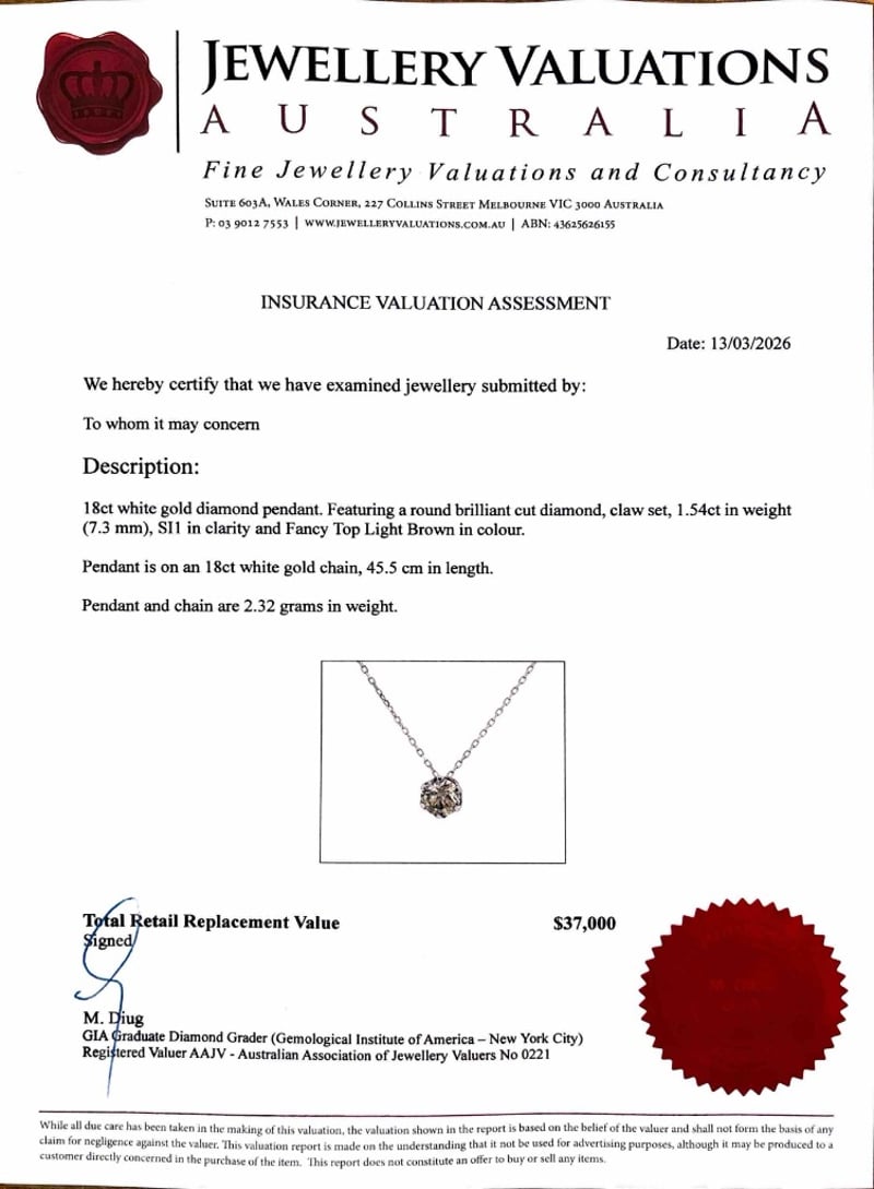 18CT WHITE GOLD DIAMOND PENDANTFeaturing A Round Brilliant Cut Diamond, Claw Set, 1.54Ct In Weight (7.3 Mm), Si1 In Clarity And Fancy Top Light Brown In Colour.Pendant Is On An 18Ct White Gold Chain, 45.5 Cm In Length.Pendant And Chain Are 2.32 Grams In Weight.Condition: Good - Refer To ImagesThis valuation has been conducted by an independent third-party professional. The valuation amount is an assessment by the issuing valuer and does not reflect the auction value of the item.Any inquiries regarding the valuation should be directed to the issuing valuer (refer to contact details on the certificate), as Lloyds Auctions has no affiliation or influence over the valuation, the valuer, or the stated amount.Insurance Replacement Valuation Amount: $37,000.00163083+15