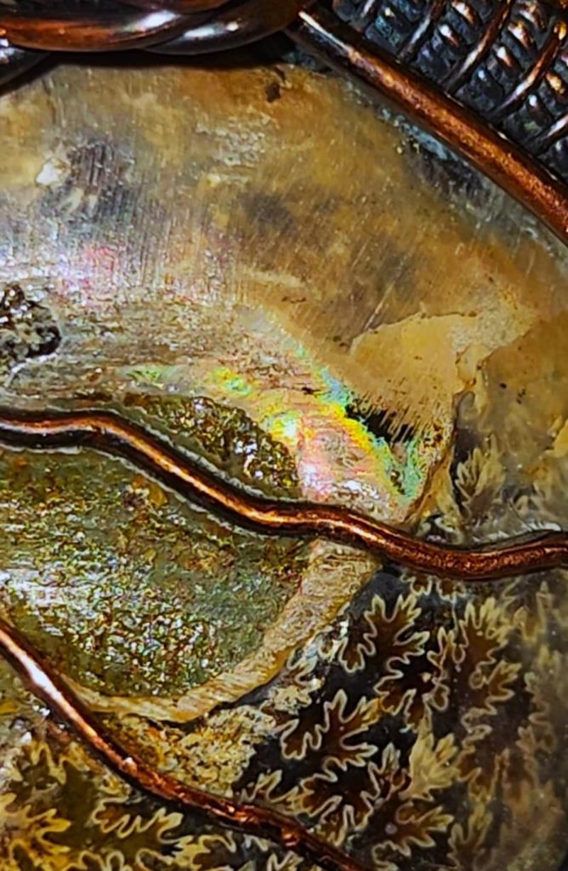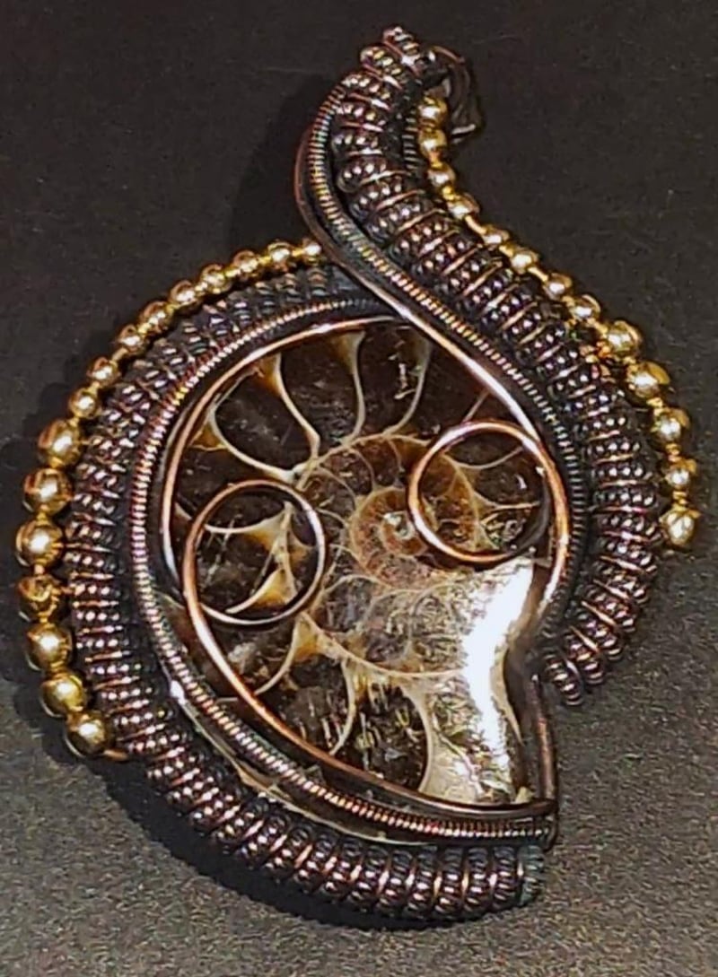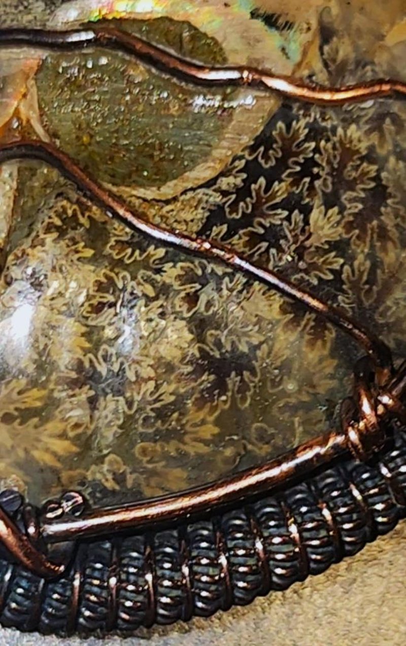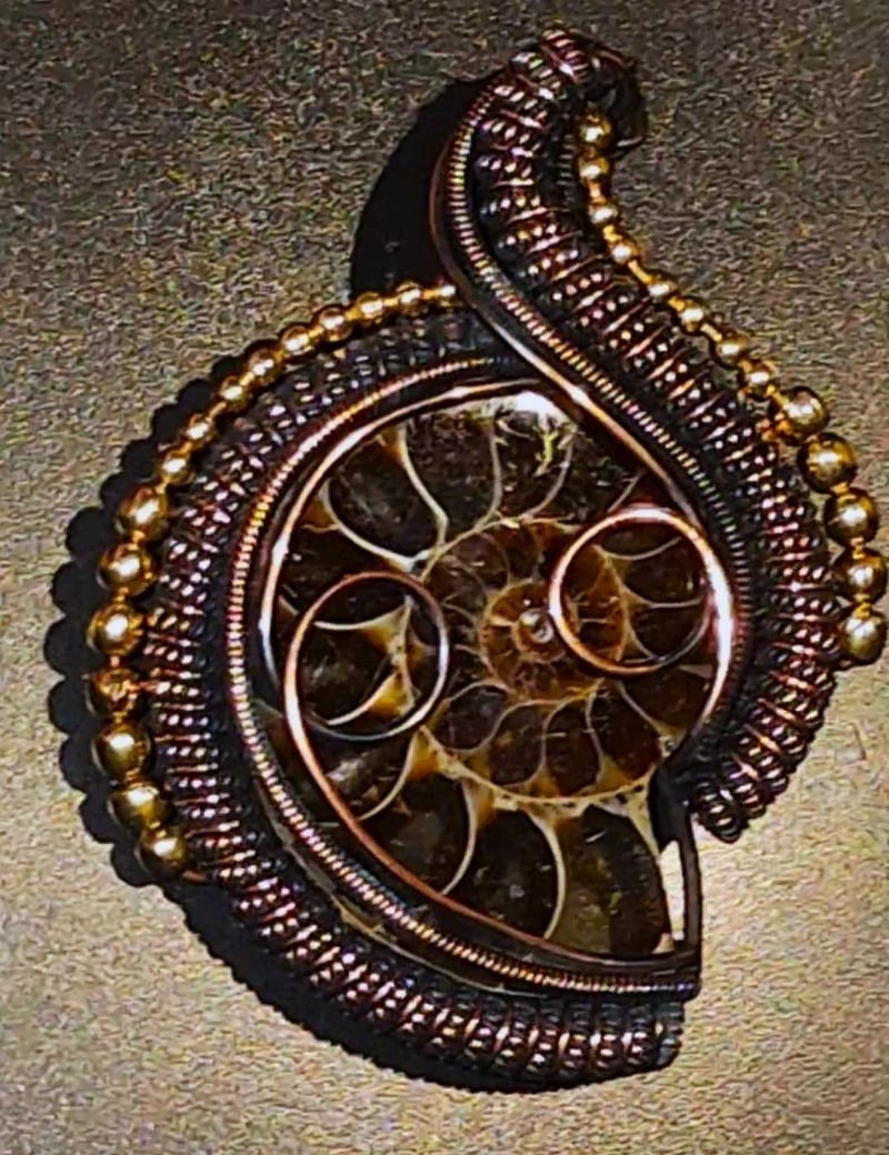 133 CARATS WIRE WRAPPED OPALISED AMMONITE INTACT SHELL FOSSIL.
