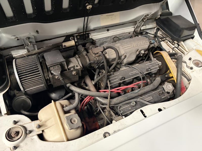 This example has been fitted with a Lancia 2.0-litre engine and gearbox in place of the original 1.5-litre unit. It is a common and well-regarded upgrade that lifts performance meaningfully without disturbing the original mid-engine layout. The body presents well in white with straight panels, good gaps, and no obvious structural rust visible from exterior photos. The removable targa hardtop is in place. Wheels show some surface corrosion and the paint has aged to a flat chalky finish in places, but structurally the car appears honest.