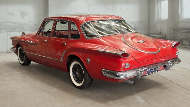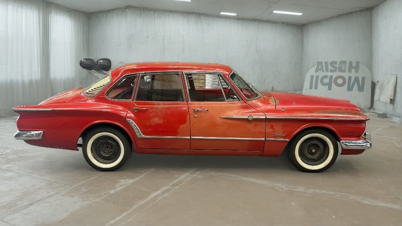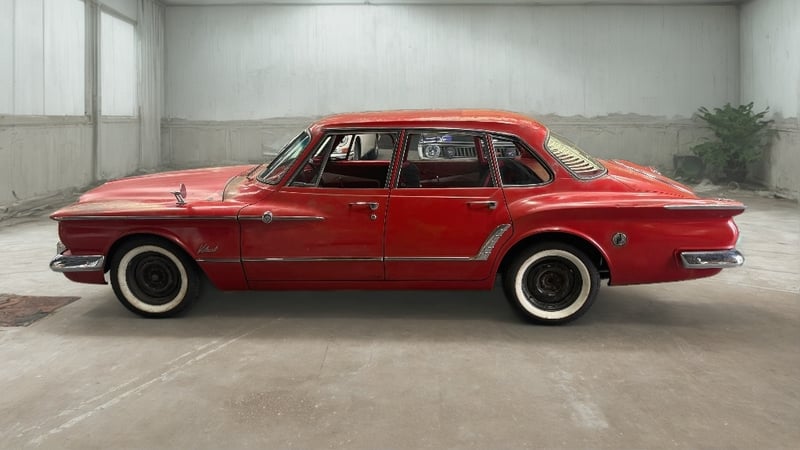 1961 Plymouth Valiant, 4-door sedan, slant six engine, automatic transmission, red exterior.