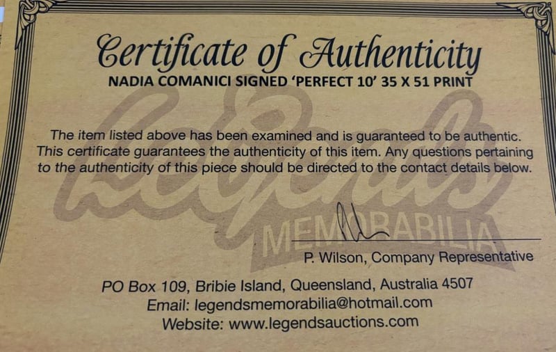 NADIA COMANICI SIGNED OLYMPIC PERFECT '10' PRINTNadia Comanici Personally Signed Olympic 'Perfect 10' Quality Print. The 14 Year Old Romaninian Gymnast Achived The First Ever 10 At The 1976 Olympic Games Creating History. The Print Is 35Cm X 51Cm In Size. The Item Is Accompanied By A Certificate Of Authenticity.Condition: Good - Refer Images584529+53