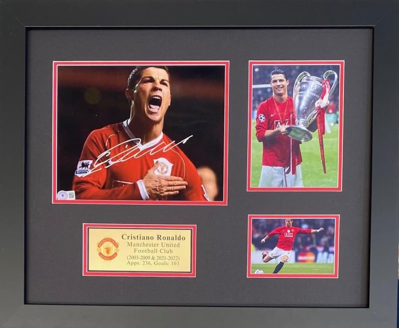 CRISTIANO RONALDO (MANCHESTER UNITED) PERSOANLLY SIGNED 10" X 8" PHOTOGRAPH (BECKETT COA)Framed Using Double Mats, 2 Unsigned Photographs And A Plaque. Hand Signed By Cristiano Ronaldo Using A Black MarkerAccompanied By A Certificate Of Authenticity From BeckettCondition: Good - Refer Images10209+13