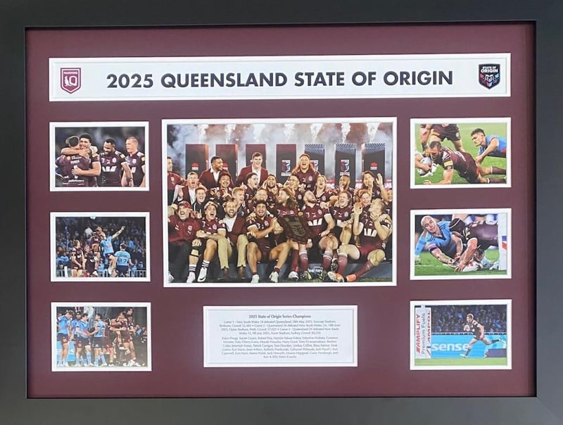 QUEENSLAND, 2025 STATE OF ORIGIN SERIES CHAMPIONSFramed Using Double Mats, Glass And A Black Frame Condition: Good - Refer Images10209+20