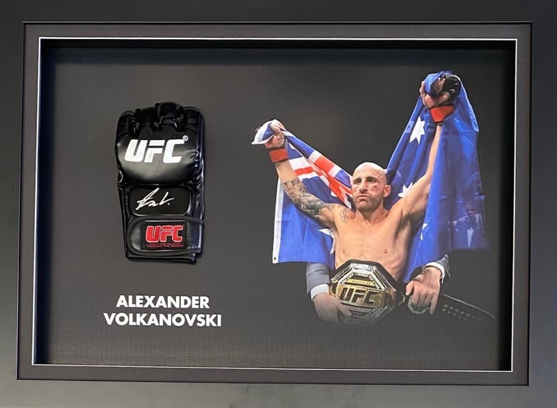 ALEXANDER VOLKANOVSKI PERSOANLLY SIGNED UFC GLOVE Framed Using A Sigle Mat, A Backdrop And A Black Frame Hand Signed By Alexander Volkanovski Using A Silver MarkerAccompanied By A Certificate Of Authenticity Condition: Good - Refer Images498066+10