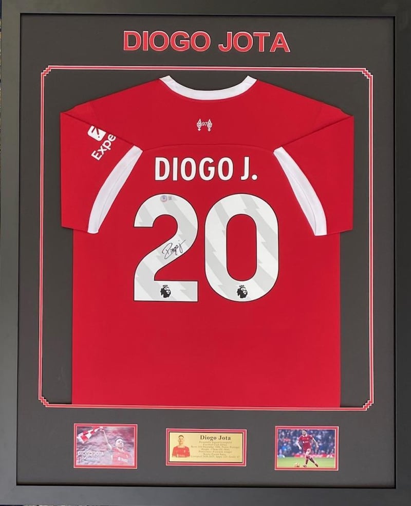 DIOGO JOTA PERSONALLY SIGNED LIVERPOOL FOOTBALL CLUB JERSEY Framed Using Double Mats, 2 Unsigned Photographs And A Plaque. Hand Signed By Diogo Jota Using A Black MarkerAccompanied By A Certificate Of Authenticity From Beckett Condition: Good - Refer Images498066+22